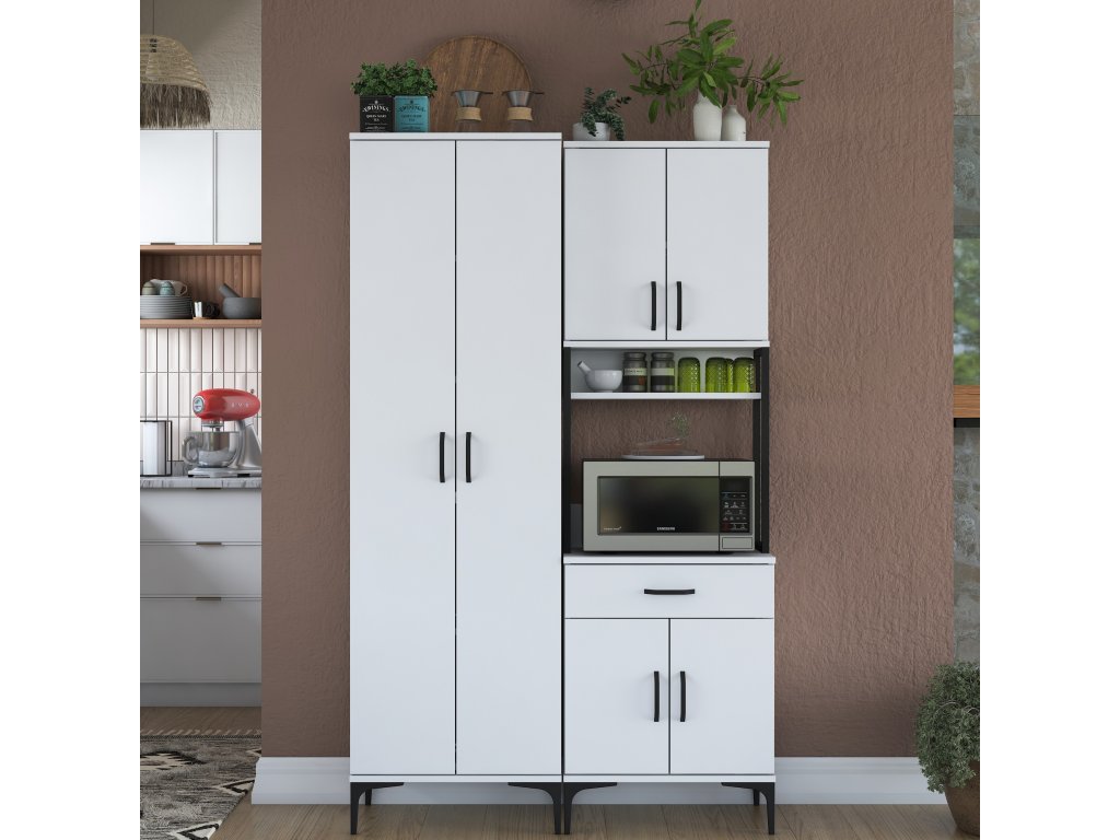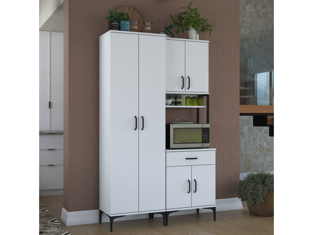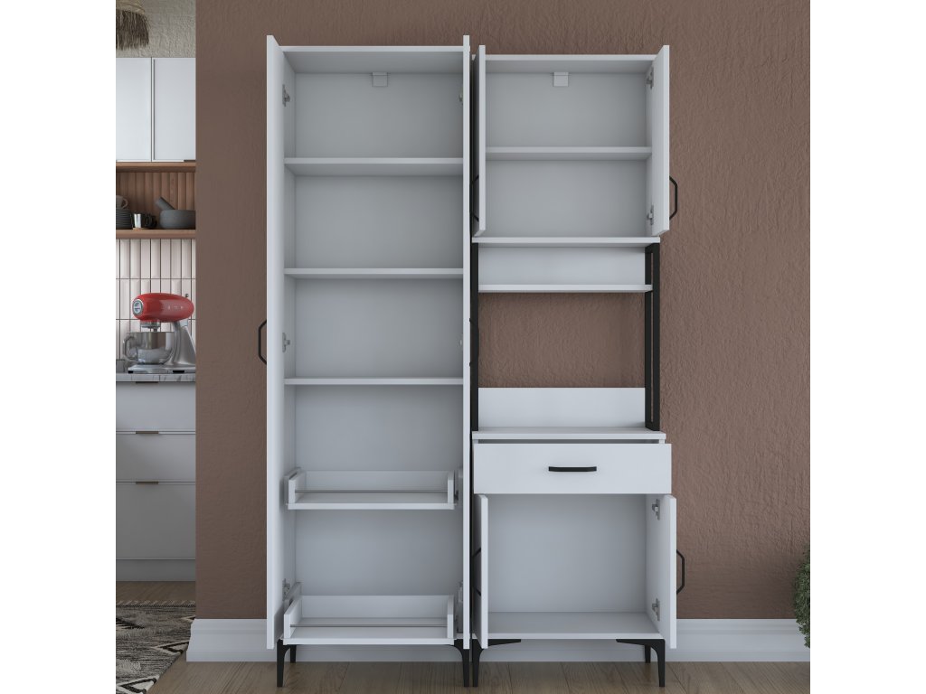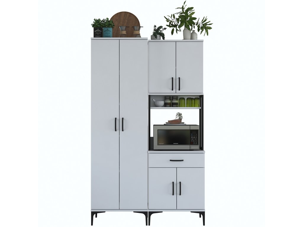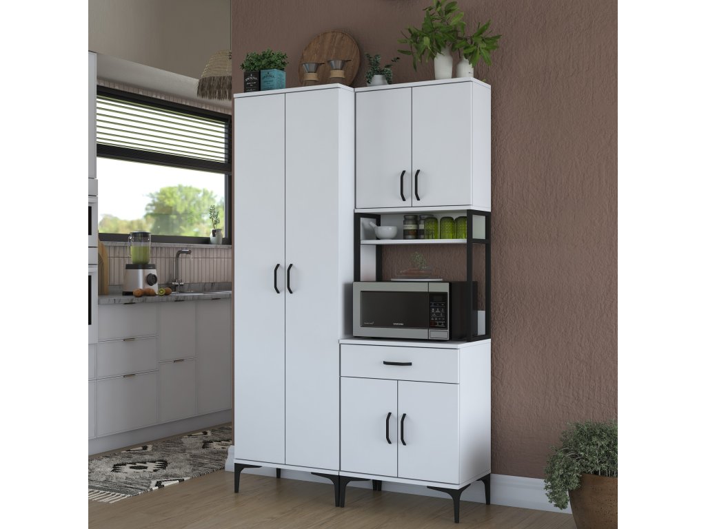 Skriňa VICTOR ponúka dostatok úložného priestoru vďaka šiestim plným dvierkam, jednej zásuvke a otvorenému regálku, ktorý je ideálny pre mikrovlnnú rúru alebo kuchynské spotrebiče. Tento praktický a viacúčelový dizajn umožňuje uloženie riadu, príslušenstva aj potravín na jednom mieste.