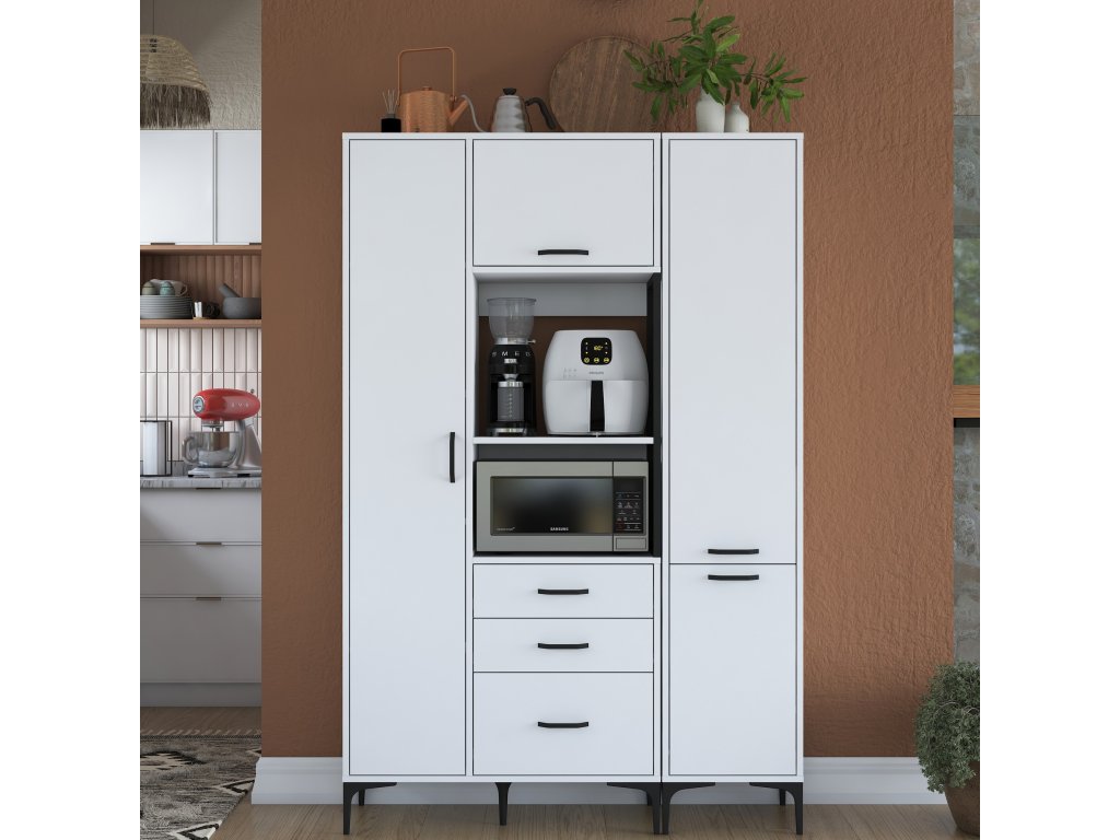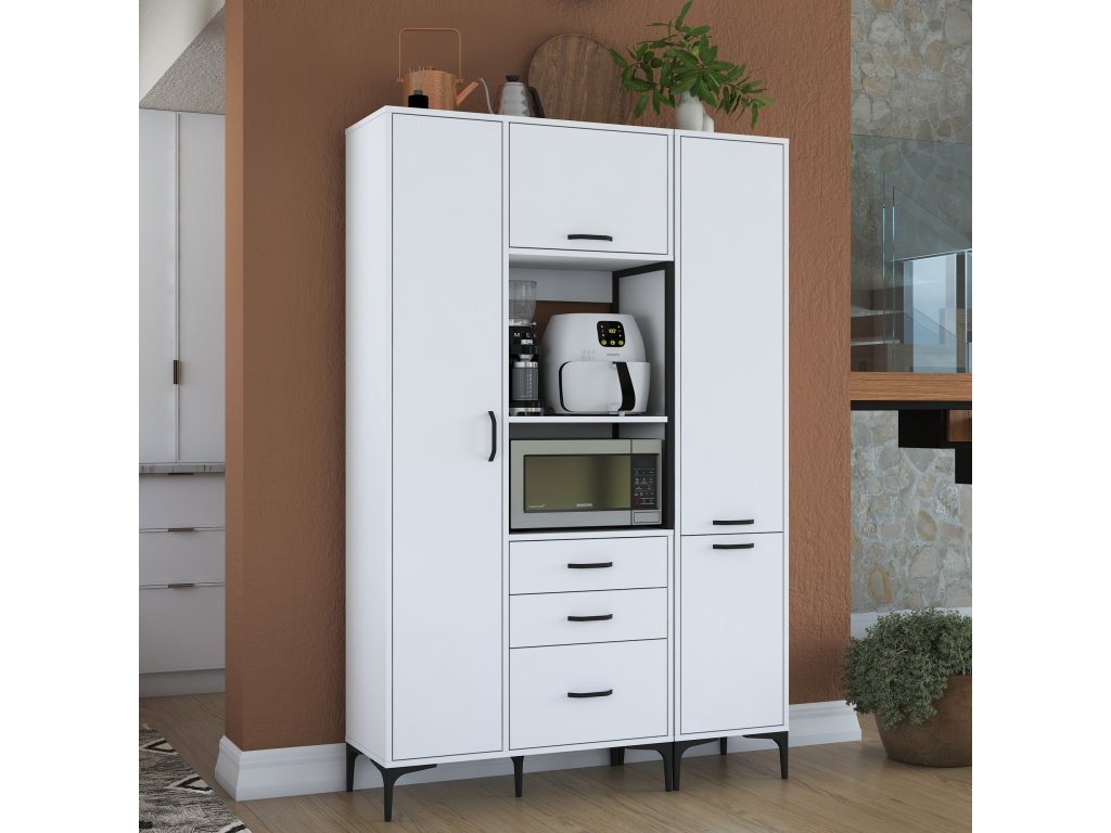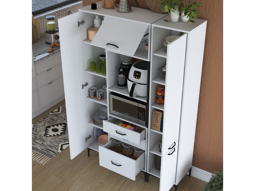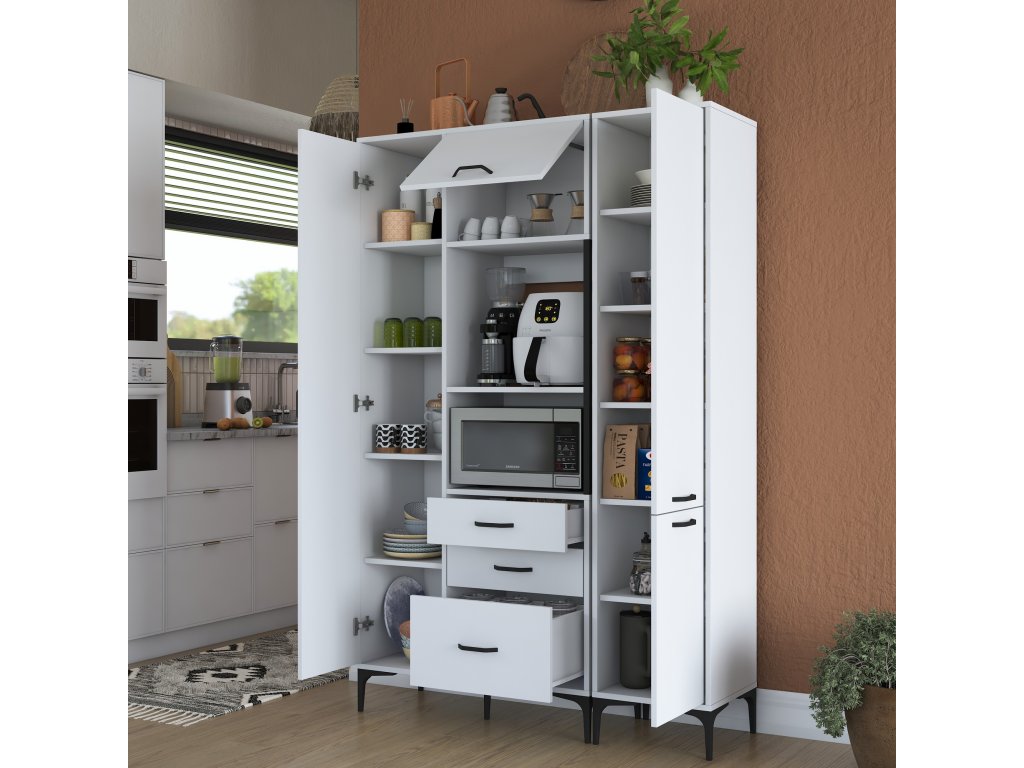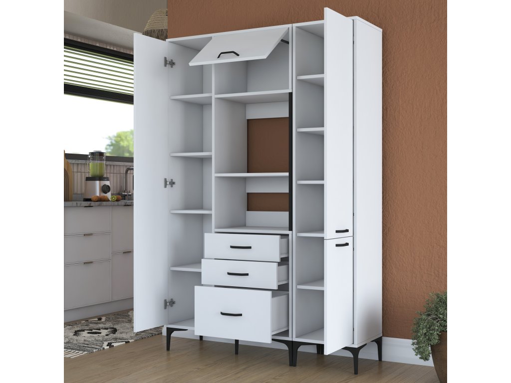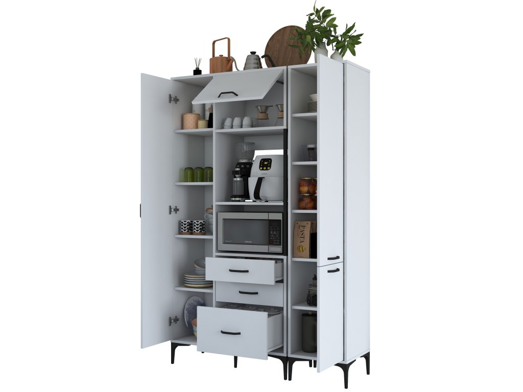 Vysoko kvalitné materiály, ako je melamín a VT laminát, zaisťujú odolnosť proti opotrebovaniu a jednoduchú údržbu. Vďaka svojmu vysokému dizajnu efektívne využíva priestor, zatiaľ čo elegantný biely vzhľad dodáva kuchyni moderný nádych. Skriňa je dodávaná v demontovanom stave s prehľadným návodom na zostavenie.