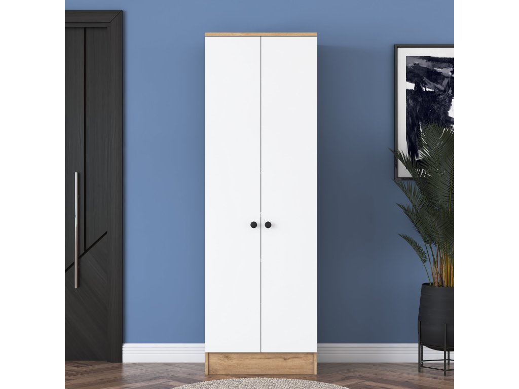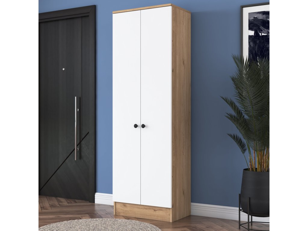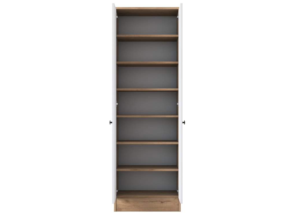 Policová skriňa WALL je ideálnym doplnkom do moderného interiéru. Spojenie bielej farby s dekorom orecha prináša eleganciu a praktickosť. Vďaka plným dvierkam ponúka diskrétny úložný priestor, ktorý vám pomôže udržať poriadok a zlepšiť organizáciu vašich vecí.