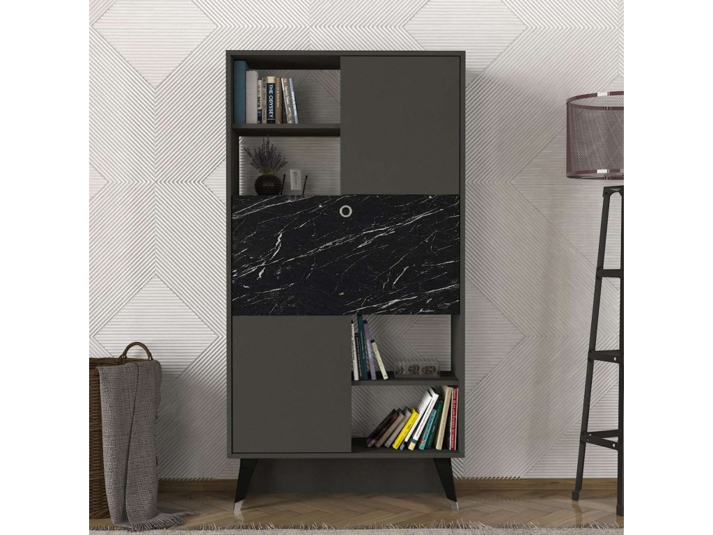 Regál ADICA vyniká svojim moderným a praktickým dizajnom, ktorý sa skvele hodí do akéhokoľvek interiéru. Dve pevné police, dve skrinky a výklopná skrinka, ktorá môže slúžiť ako stolík na notebook, poskytujú dostatok úložného priestoru na knihy, dekorácie či kancelárske potreby. Kombinácia antracitového a čierneho mramoru dodáva regálu elegantný vzhľad. Robustný LTD materiál s hrúbkou 18 mm zaisťuje dlhú životnosť a stabilitu tohto regálu.