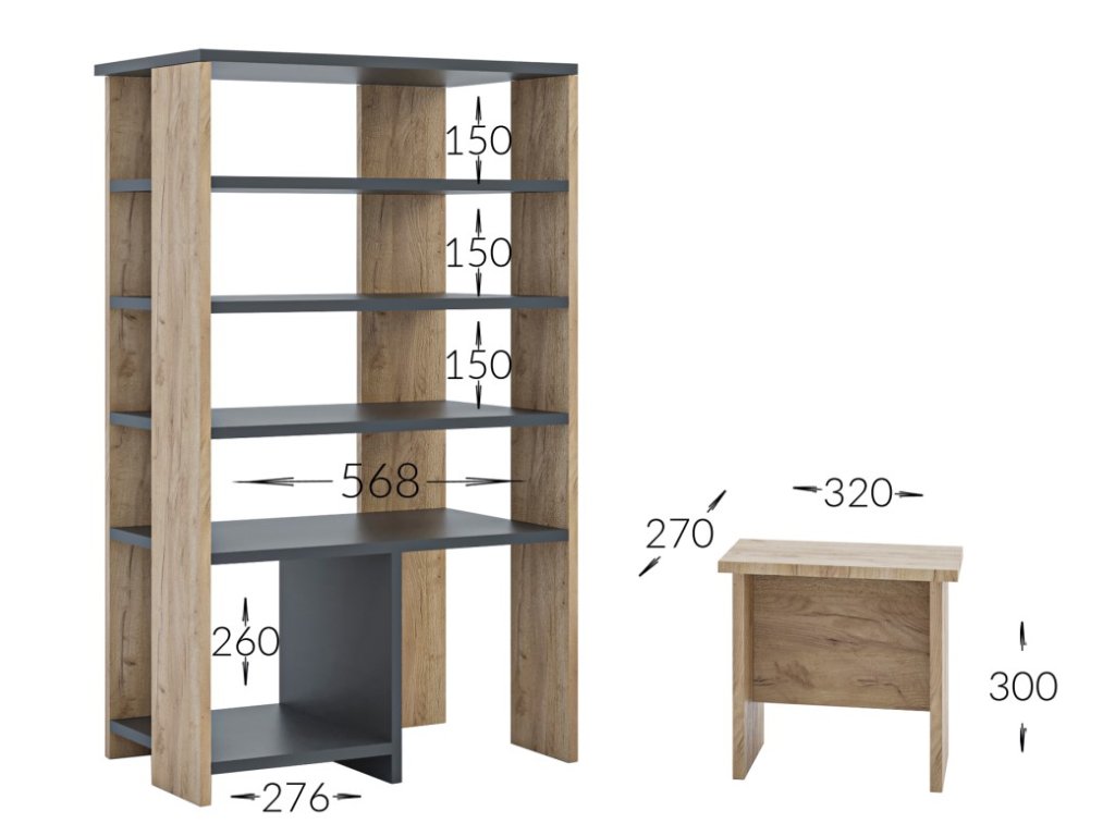 Farebné prevedenie: antracit (poličky)/ dub kraft zlatý (konštrukcia).