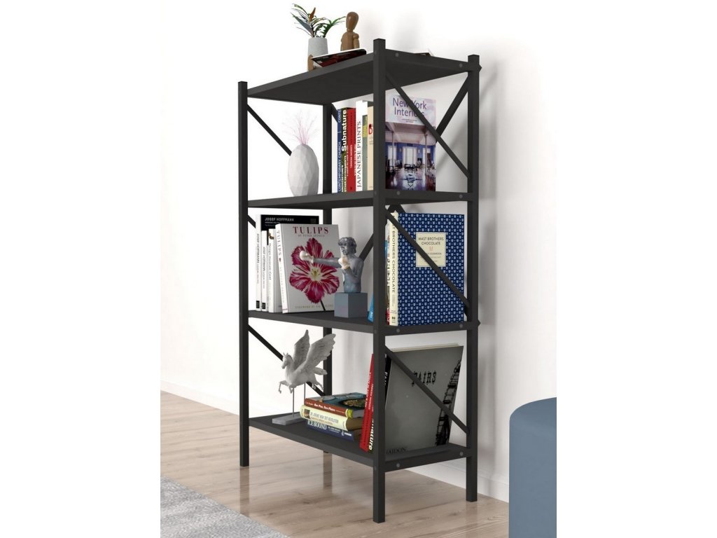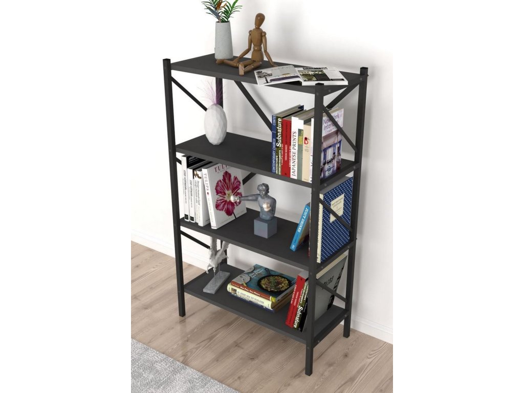 Dosky regálu sú vyrobené z 18 mm drevotrieskovej dosky. Konštrukcia je vyrobená z kovu v čiernom prevedení.