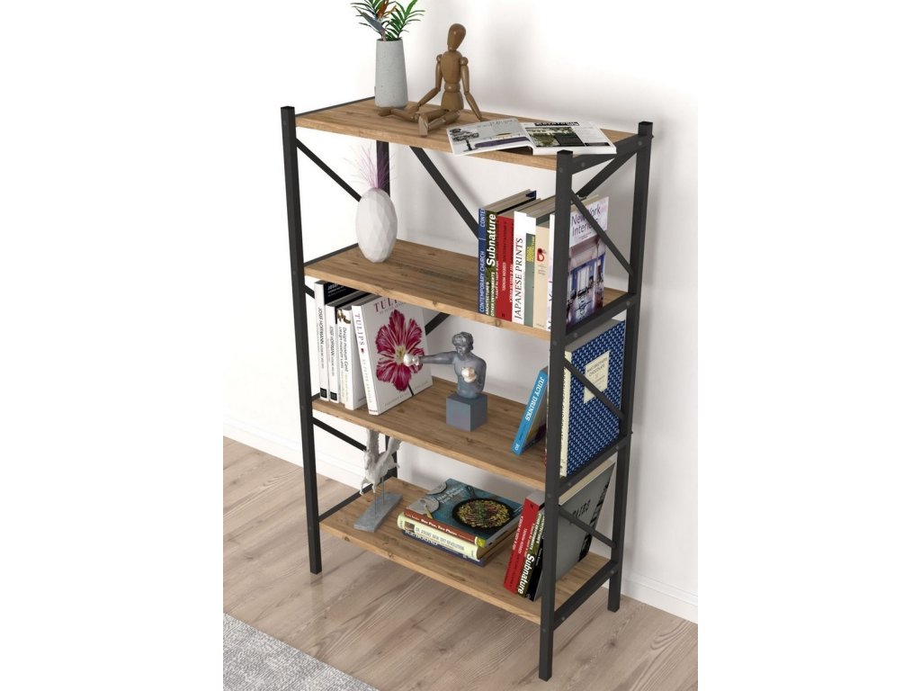Dosky regálu sú vyrobené z 18 mm drevotrieskovej dosky. Konštrukcia je vyrobená z kovu v čiernom prevedení.