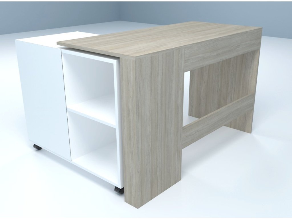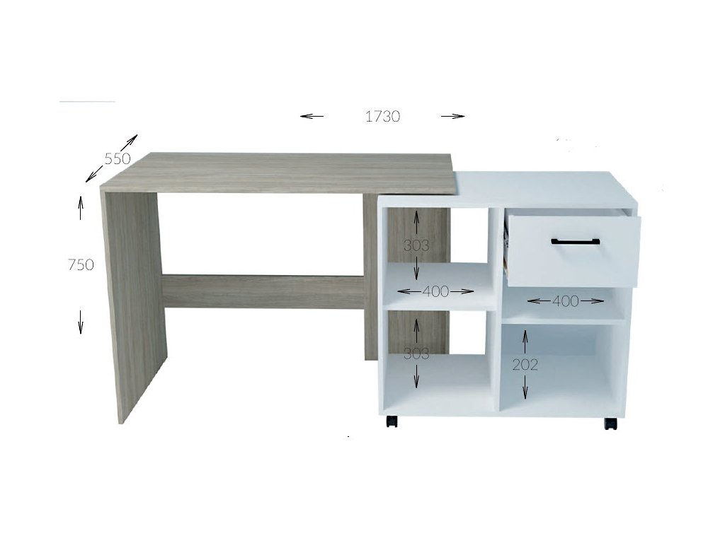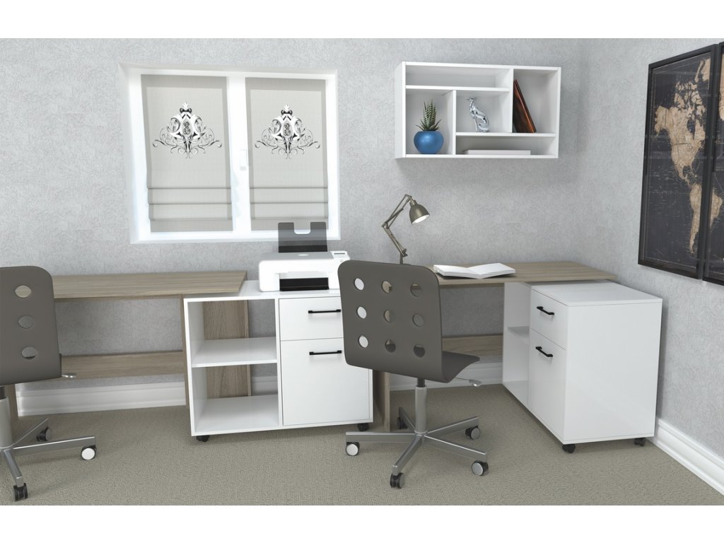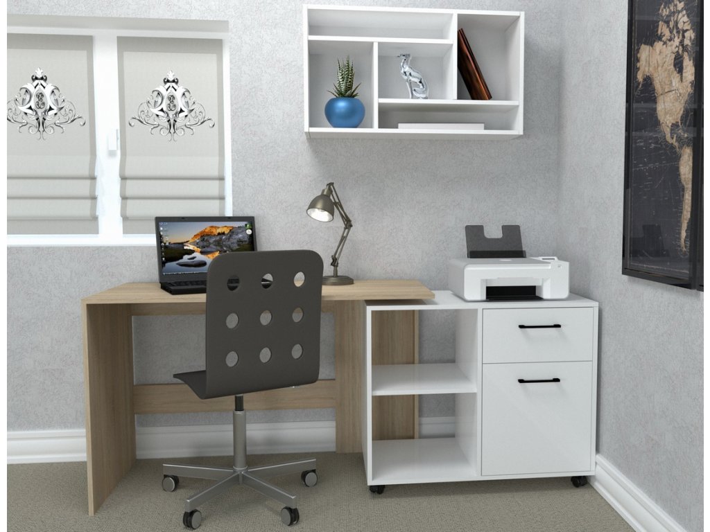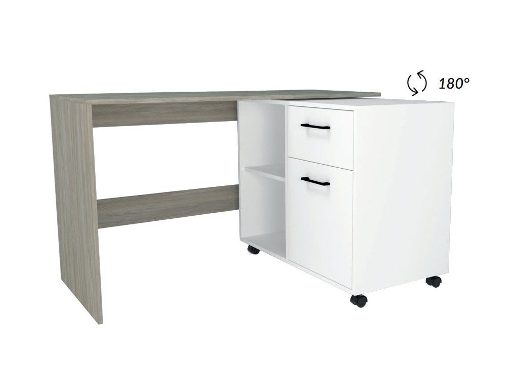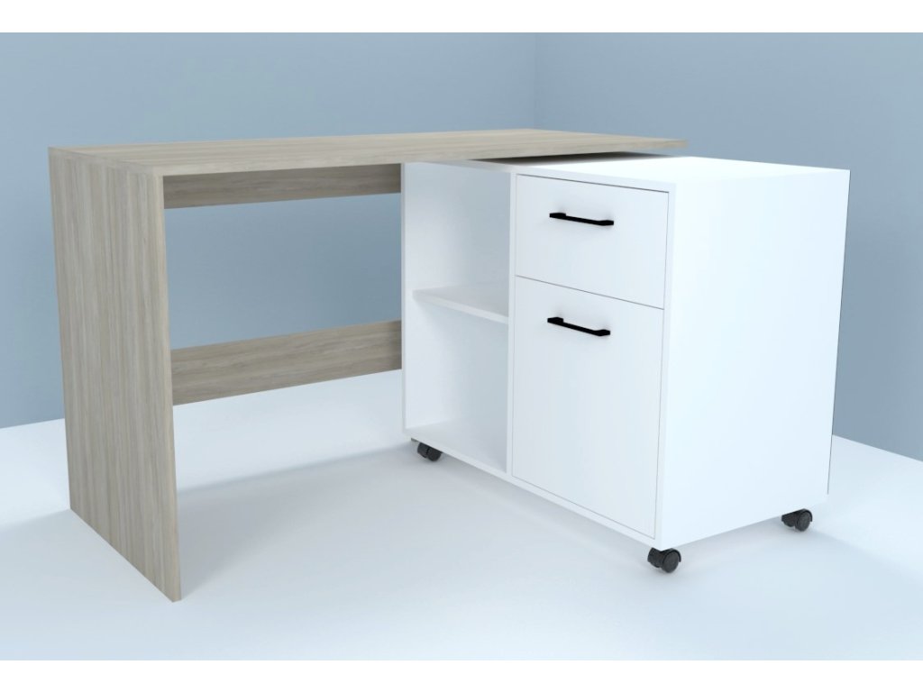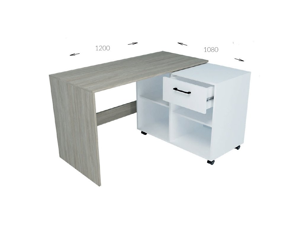 Pracovný stôl SALLY je variabilným nábytkom vhodným do detskej izby aj pracovne. Vďaka štýlovému kontajneru na kolieskach si dokážete vytvoriť pracovný priestor prispôsobený aktuálnej potrebe a požiadavkám. Stolík dokážete využívať ako rovný aj ako rohový stôl. Oceníte veľkú pracovnú dosku aj praktický odkladací priestor. Kontajner ponúka 2 otvorené poličky a 2 šuplíky. Nábytok je vyrobený je z kvalitnej LTD dosky, ktorá nie je náročná na údržbu. Farebné prevedenie: mestský dub/diamantová biela. Farba biely diamant nesie štruktúru dreva – nie je v lesku (viď detail na obrázku). Výrazné úchyty na šuplíkoch sú v kontrastnej čiernej farbe. Prevedenie rohu je pravé. V našej ponuke nájdete aj ľavé prevedenie. Rozmery (š/v/h): 120 x 75 x 85/55 cm.