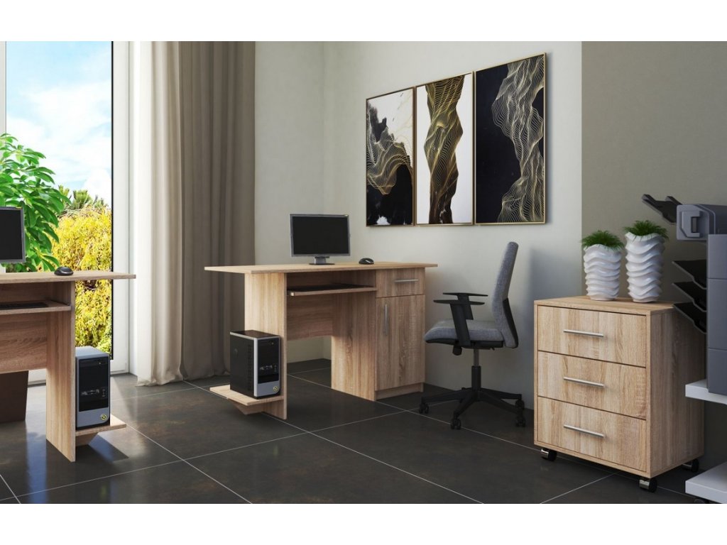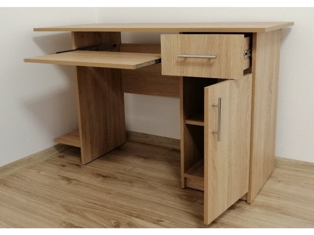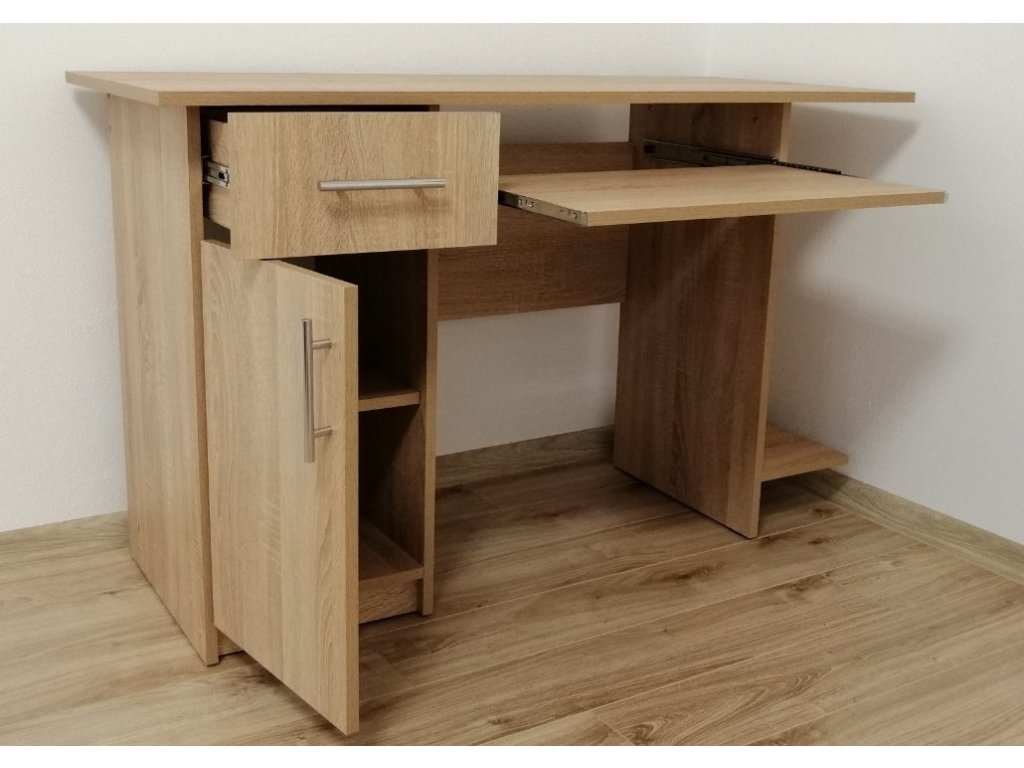 Pracovný stôl VEBER je moderný praktický písací stôl, ktorý je svojimi rozmermi vhodný doplnok aj do menších priestorov detskej izby či do kancelárie. Vyrábaný je z kvalitnej LTD dosky. Farebné prevedenie: dub sonoma. Pod priestrannou pracovnou doskou sa nachádza praktická výsuvná doska, ktorá je ideálnym riešením na umiestnenie klávesnice a počítačovej myši. Na boku je umiestnená polica na odkladanie rôznych predmetov, prípadne na umiestnenie počítača. Určite oceníte aj skrytý úložný priestor v podobe zásuvky a dvierok. Tento pracovný stôl je vhodným riešením pre všetkých, ktorí potrebujú svoj pracovný či študentský kútik a zároveň majú malý priestor na jeho umiestnenie. Dodávame v demontovanom stave.Dodatočné parametre