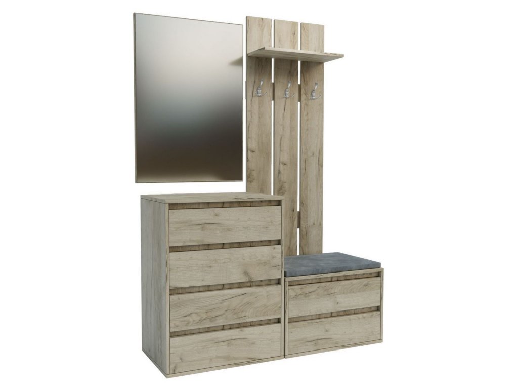 | Zostava obsahuje: | Štvorzásuvková komoda (ŠxVxH): 60 x 80 x 42 cm Dvojzásuvková skrinka na topánky s vankúšikom (ŠxVxH): 60 x 40 x 42 cm Vešiakový panel s odkladacou policou (ŠxVxH),20 x2 |