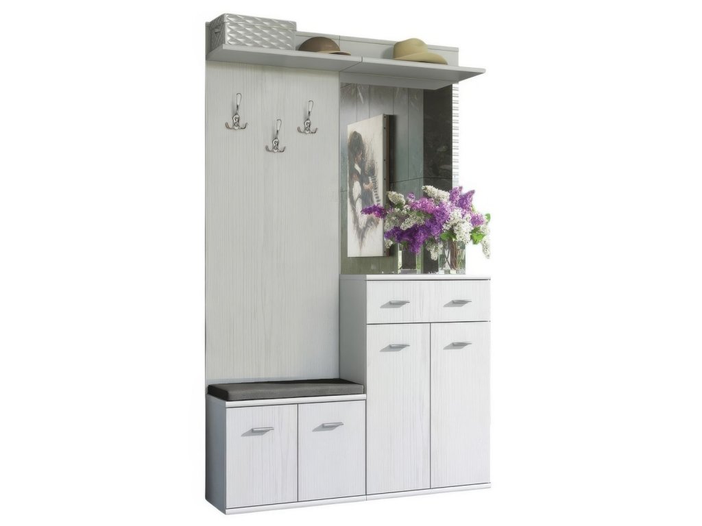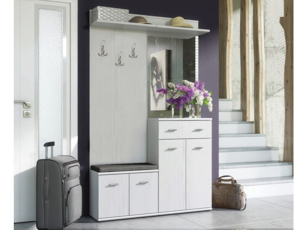 Predsieň ARMADIO v modernom farebnom prevedení biele drevo. Súčasťou predsiene je fazetové zrkadlo, vešiak, skrinky na topánky, vankúšik.