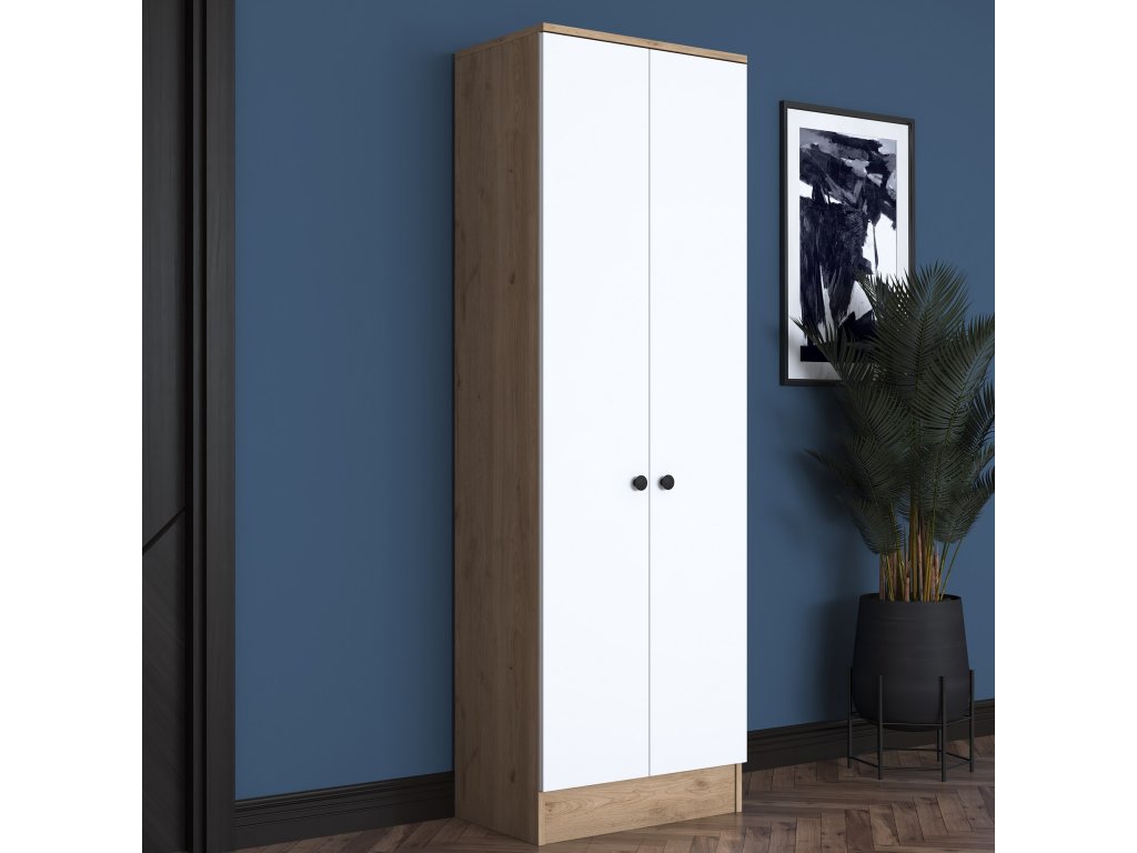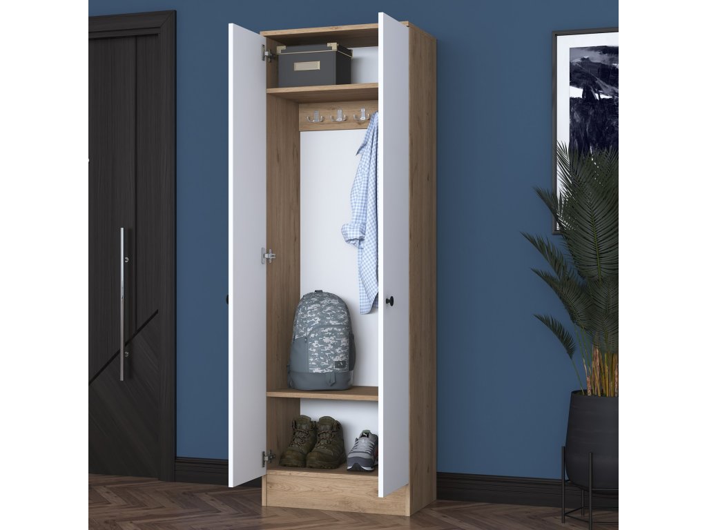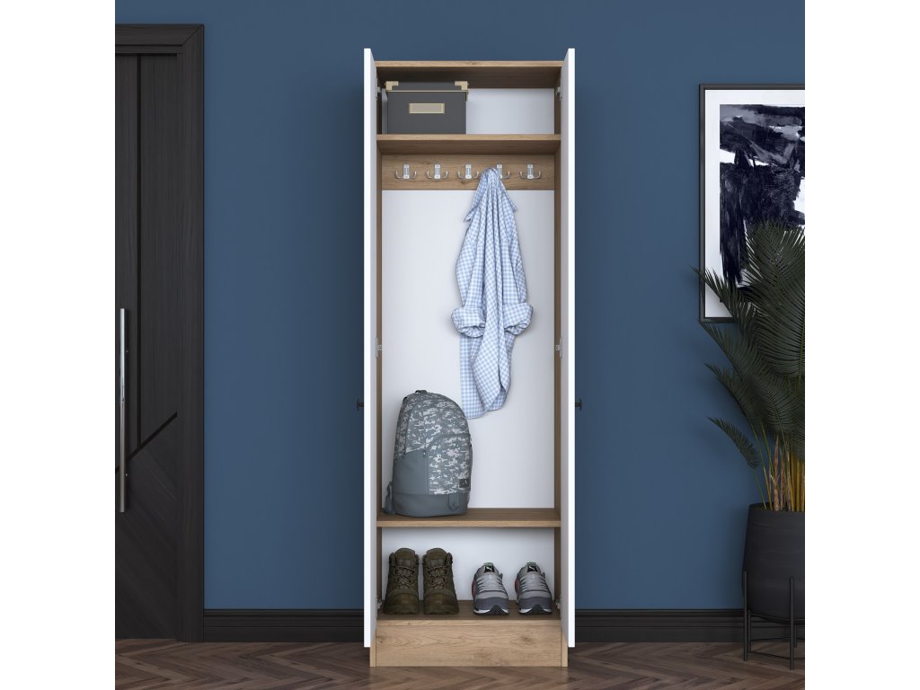 Skriňa CUBE ponúka dostatok priestoru na uloženie kabátov, topánok a ďalších nevyhnutností. Vnútorná časť je vybavená vešiakmi na odevy a praktickou policou na topánky, čo umožňuje jednoduchú organizáciu a prehľadnosť.