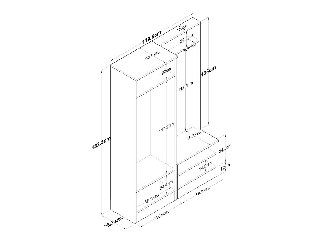 - Rozmery: 182,8 x 119,6 x 35,5 cm – kompaktná, ale priestranná zostava.