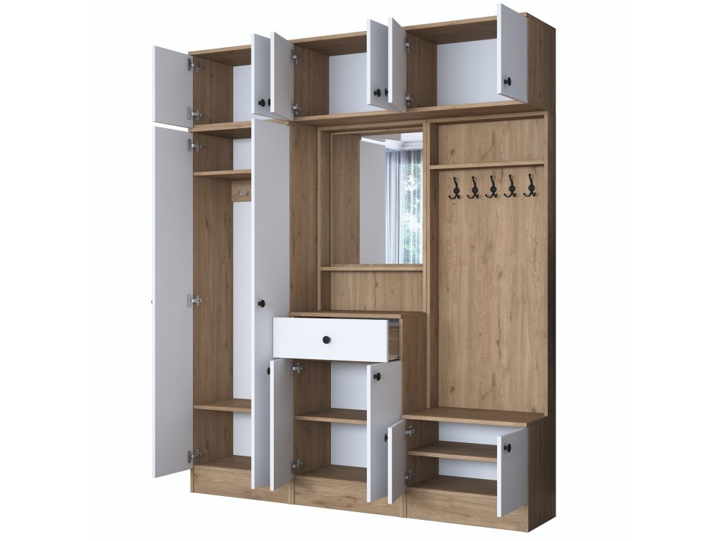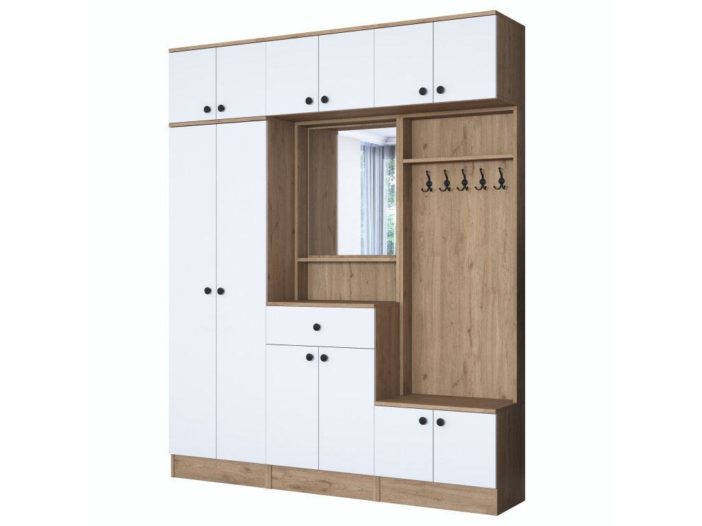 | Zostava obsahuje: | šatníková skriňa, závesná skrinka, skrine na topánky, zrkadlo, vešiak |
