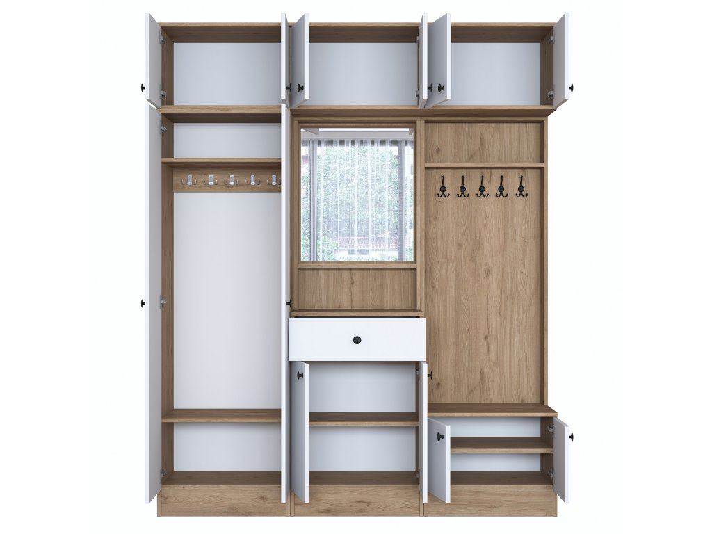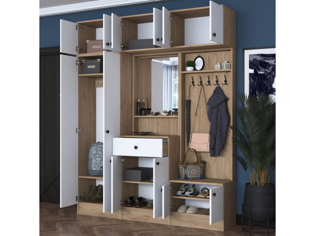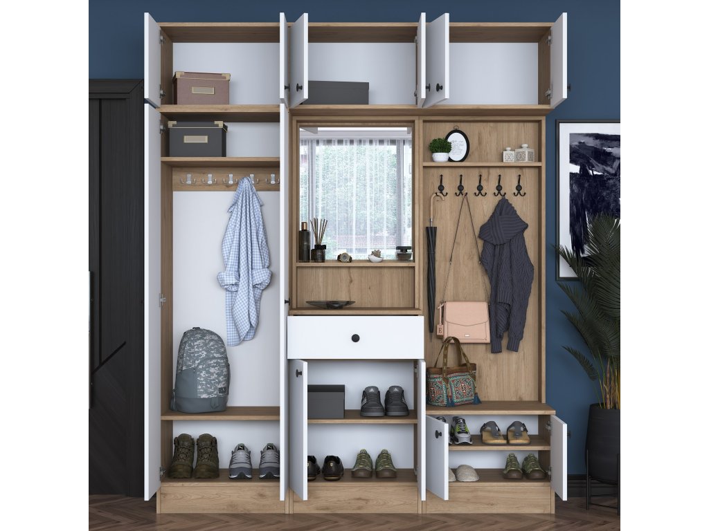 Predsiňová zostava CAPE je navrhnutá tak, aby zaisťovala maximálnu funkčnosť a štýlový vzhľad. Vďaka svojej vysokej konštrukcii a kombinácii bielej farby s dekorom orecha dodáva priestoru modernú a útulnú atmosféru. Zostava ponúka dostatok úložného priestoru a šikovných riešení pre organizáciu vašich vecí.