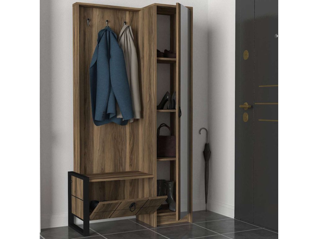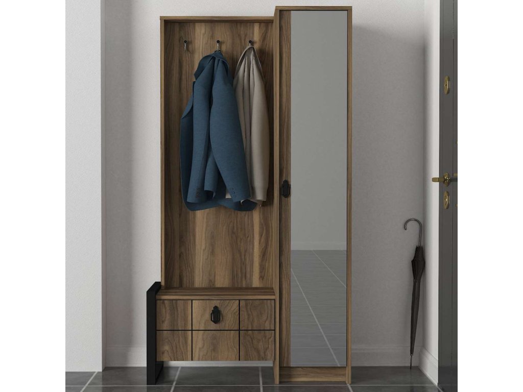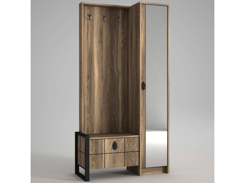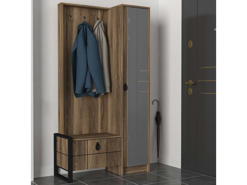 Predsiňová zostava LUST ponúka kombináciu skrine, šatníka, vešiakov a veľkého zrkadla, čo zaisťuje dostatok úložného priestoru pre všetky vaše potreby. Vyrobená z kvalitných materiálov LTD, skla a kovu s hrúbkou 18 mm, zaručuje dlhú životnosť a odolnosť. Farba orecha dodáva zostave moderný a prírodný vzhľad, ktorý ľahko zapadne do každého interiéru.