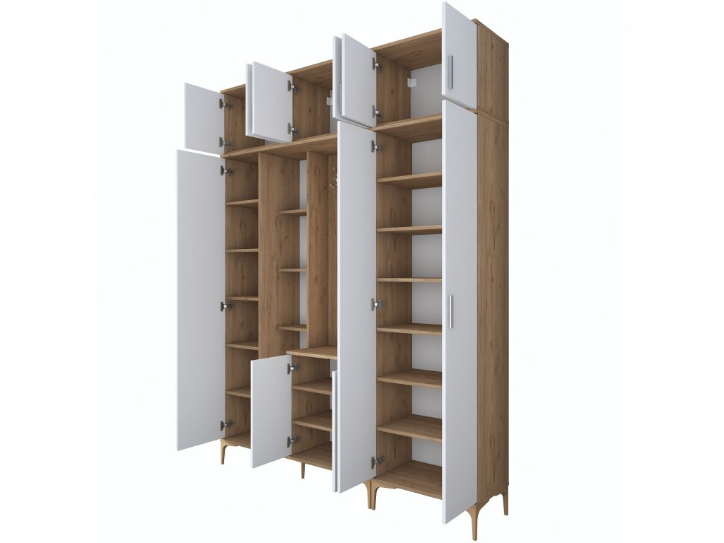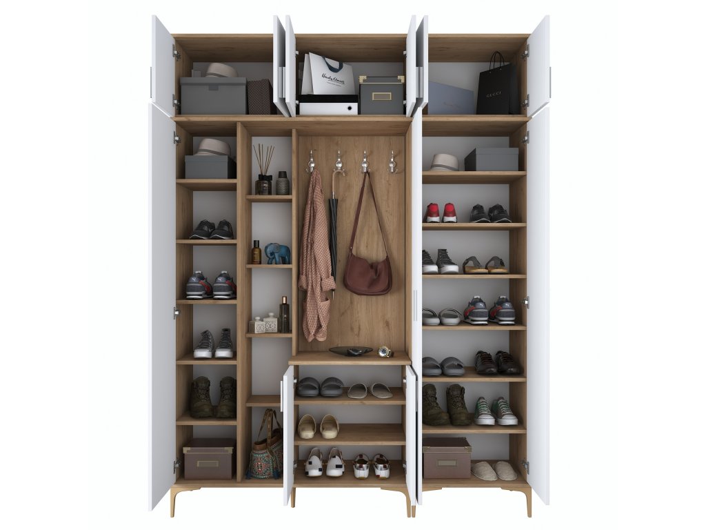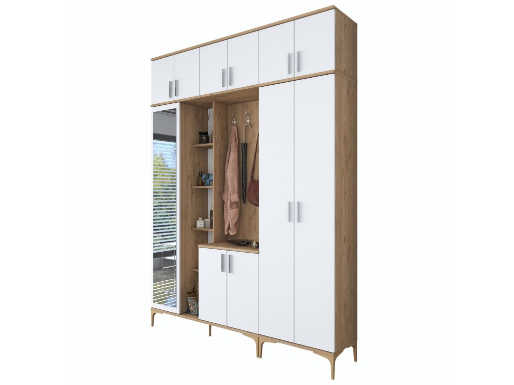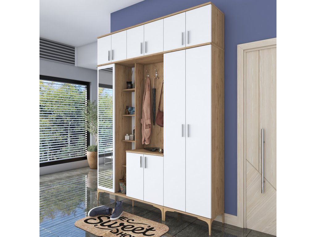 | Zostava obsahuje: | skriňa so zrkadlom, skrinka na topánky, vešiaky, šatníková skriňa, závesná skriňa |