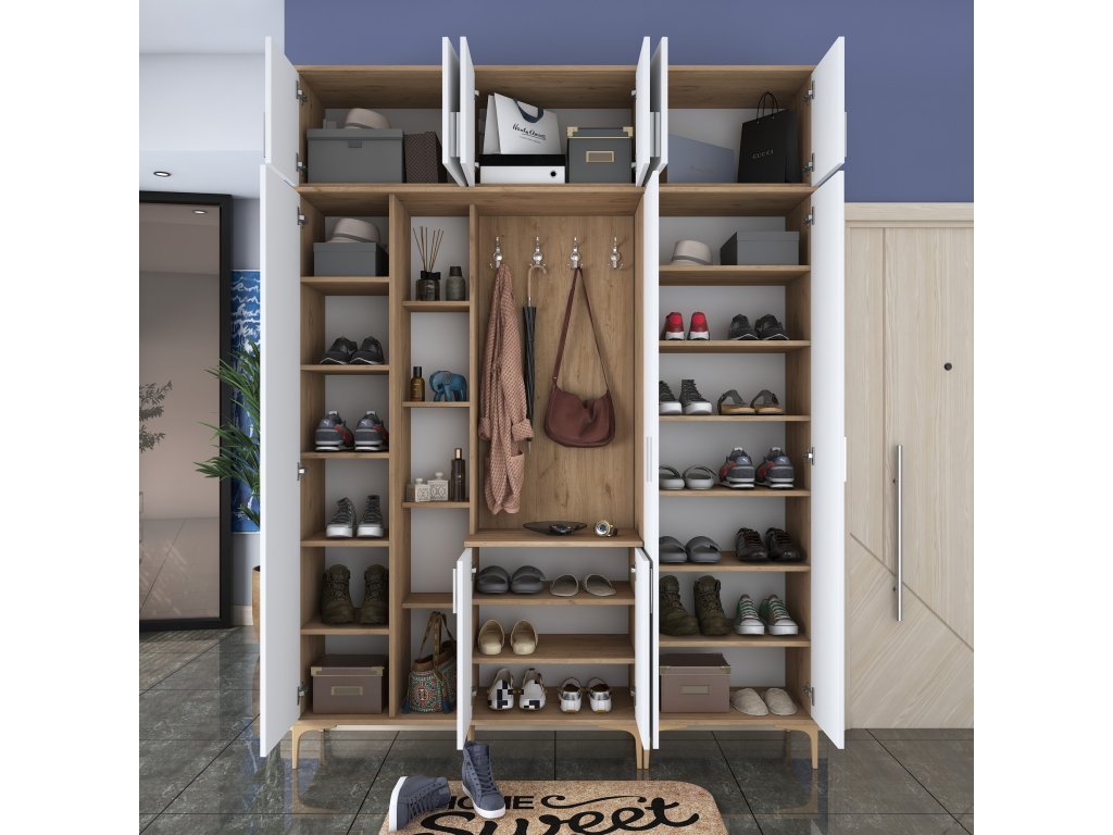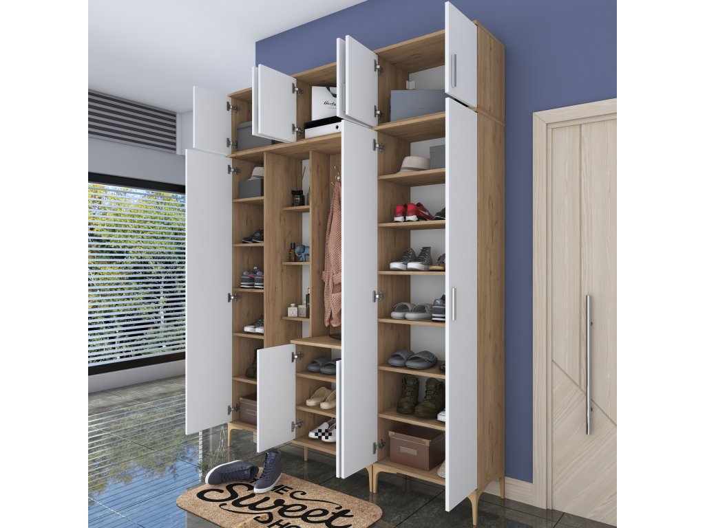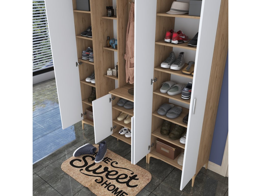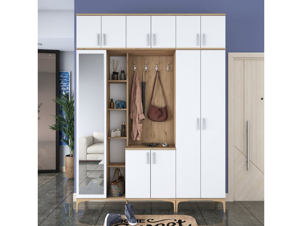 Predsiňová zostava BAY je dokonalou kombináciou elegancie a funkčnosti. S moderným dizajnom v bielej farbe s orechovým dekorom dodáva vašej predsieni útulný a organizovaný vzhľad. Ideálna voľba pre každý domov!