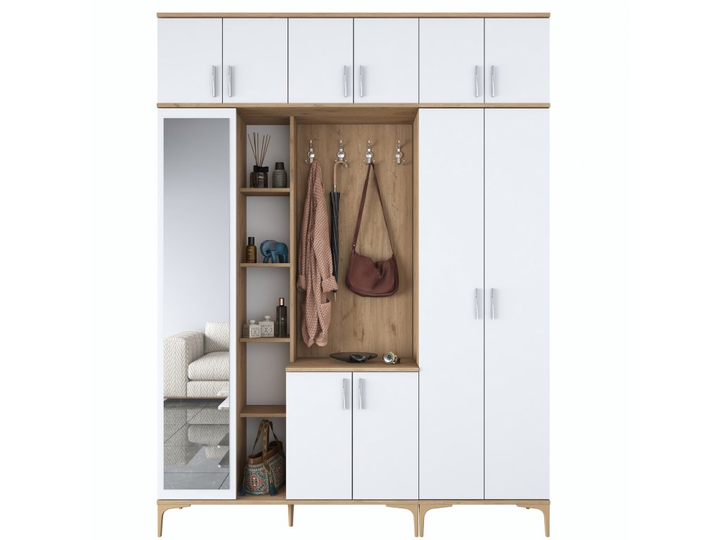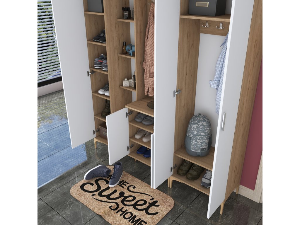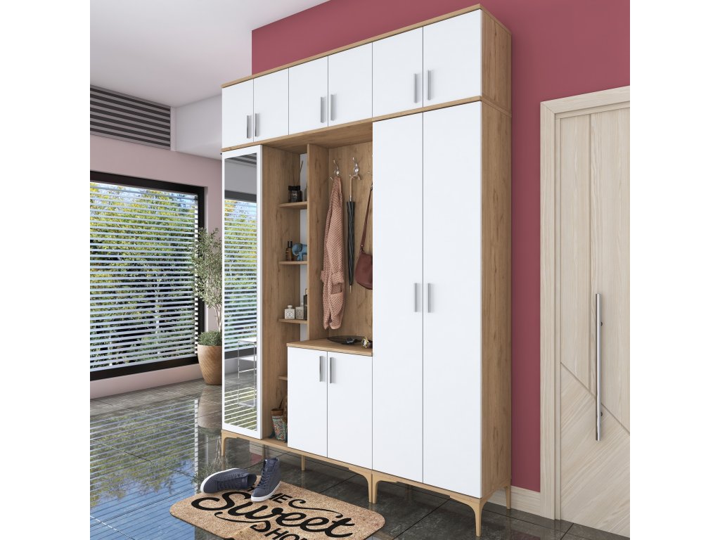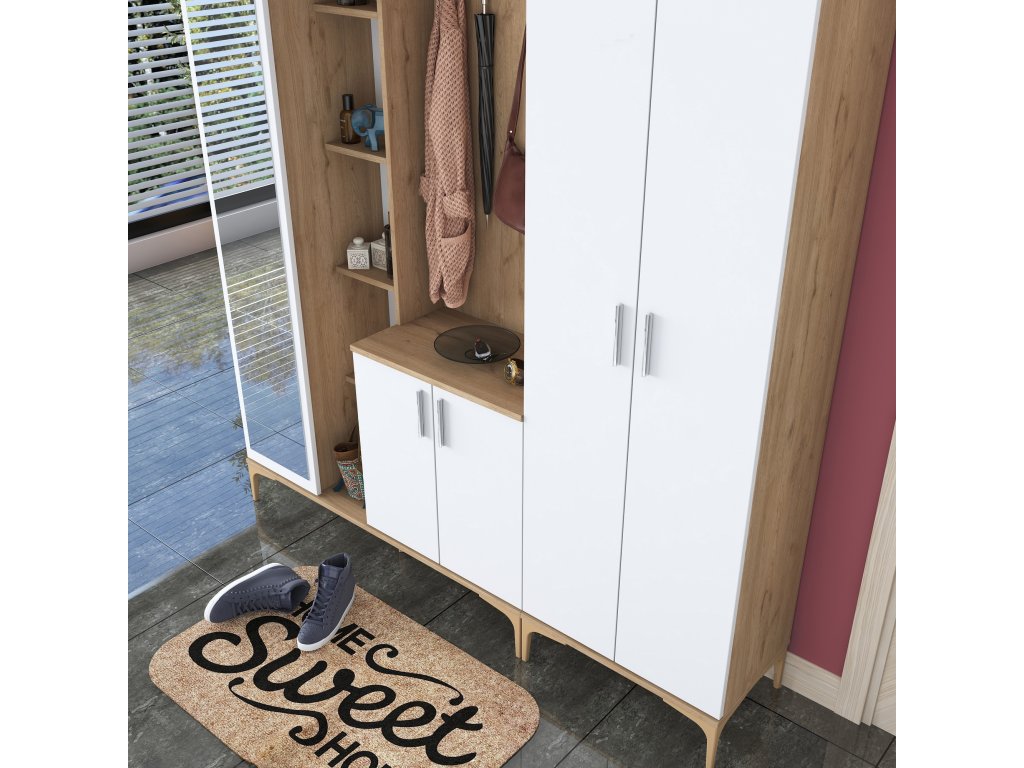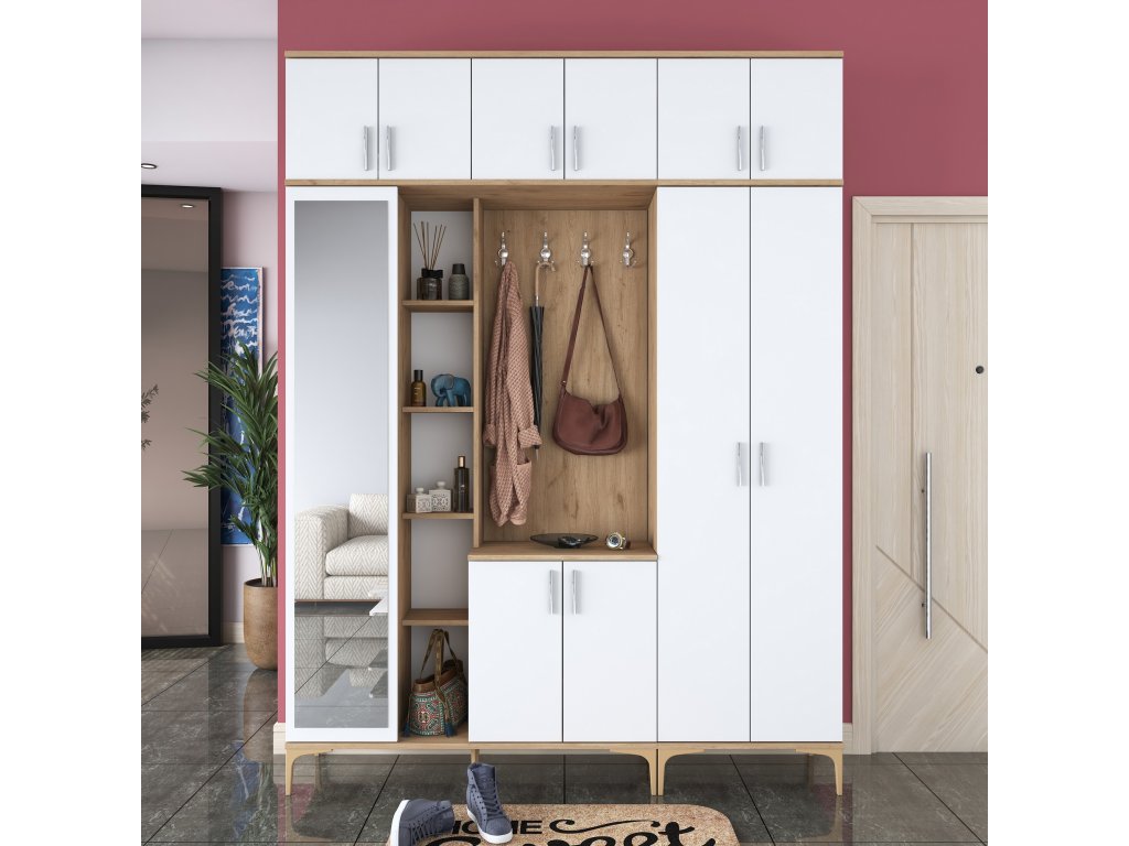 Predsiňová zostava CURTIS kombinuje moderný dizajn s maximálnou funkčnosťou. Vďaka vysokému prevedeniu a kombinácii bielej farby s orechovým dekorom prináša do vašej predsiene štýlový a organizovaný vzhľad, ktorý zaujme každého návštevníka.