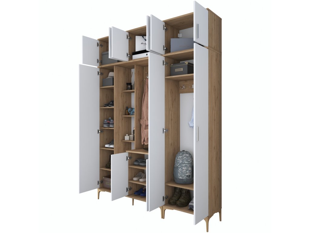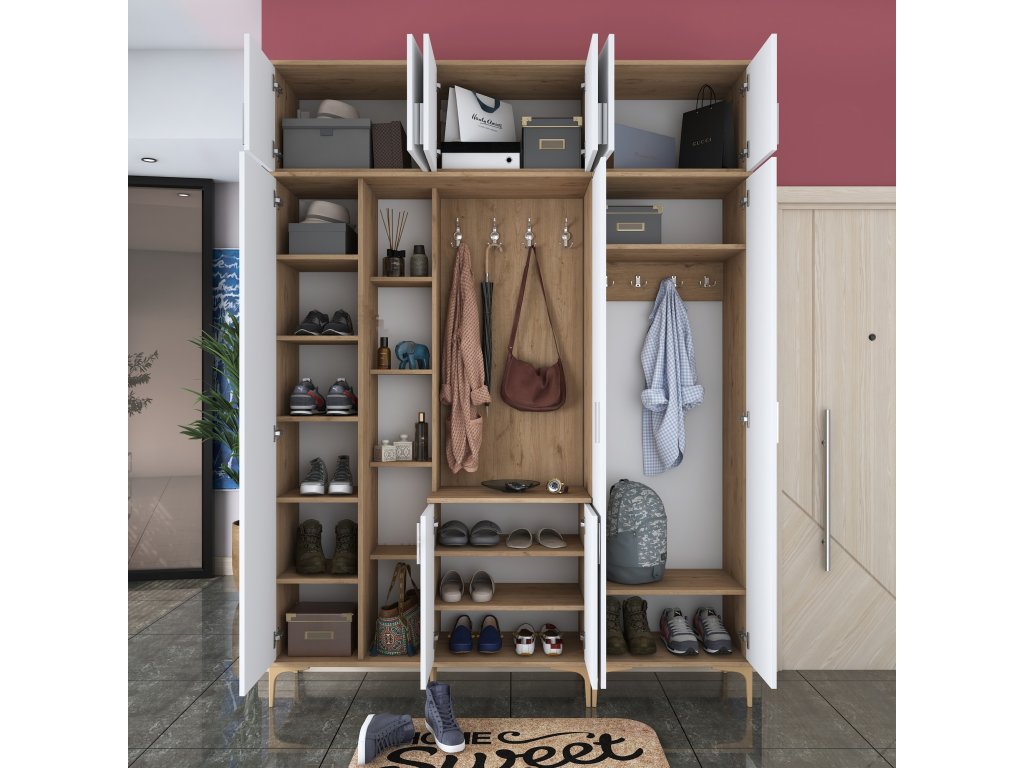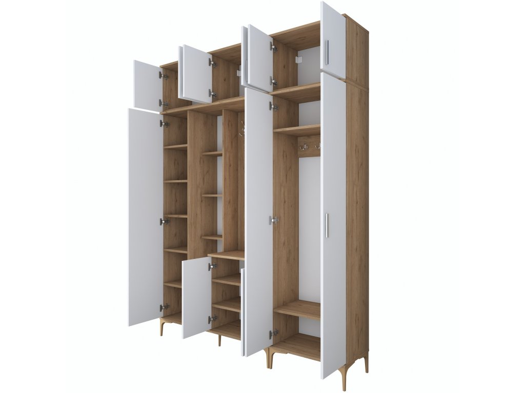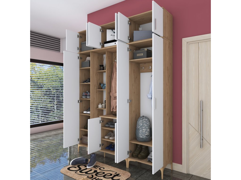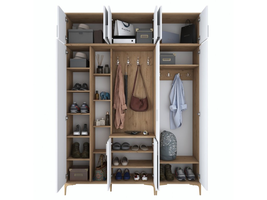 Predsiňová zostava CURTIS kombinuje moderný dizajn s maximálnou funkčnosťou. Vďaka vysokému prevedeniu a kombinácii bielej farby s orechovým dekorom prináša do vašej predsiene štýlový a organizovaný vzhľad, ktorý zaujme každého návštevníka.