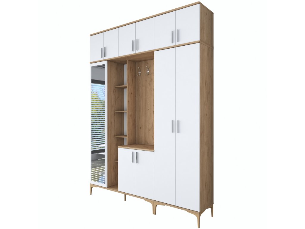 | Zostava obsahuje: | skriňa so zrkadlom, skrinka na topánky, vešiaky, šatníková skriňa, závesná skriňa |