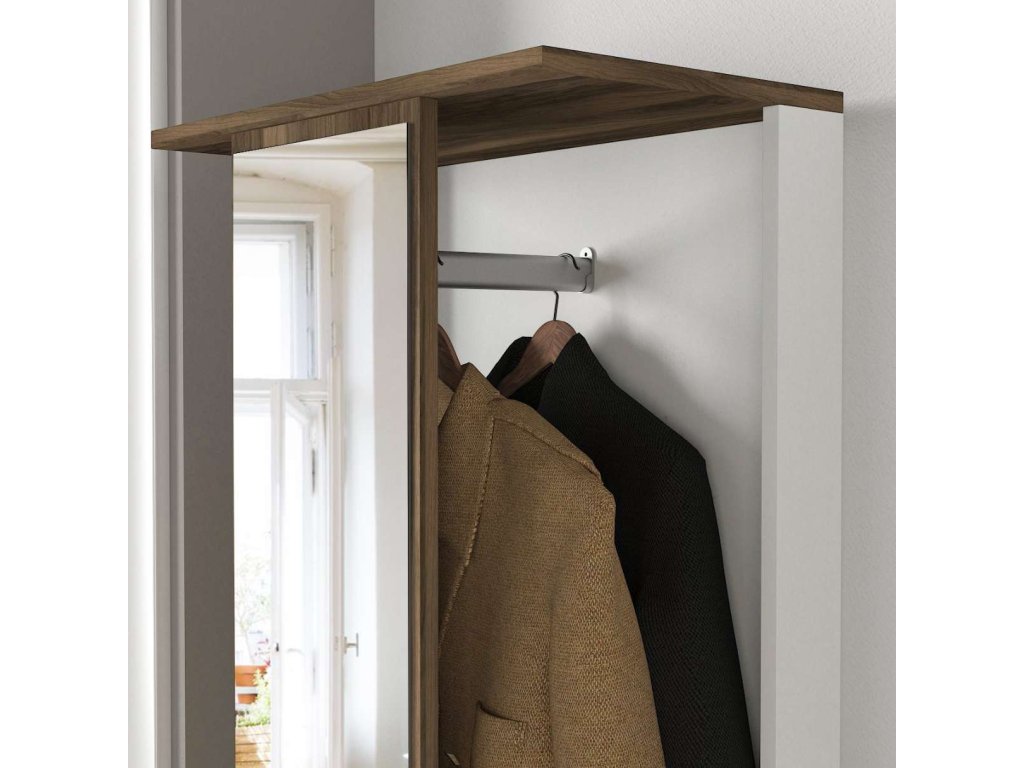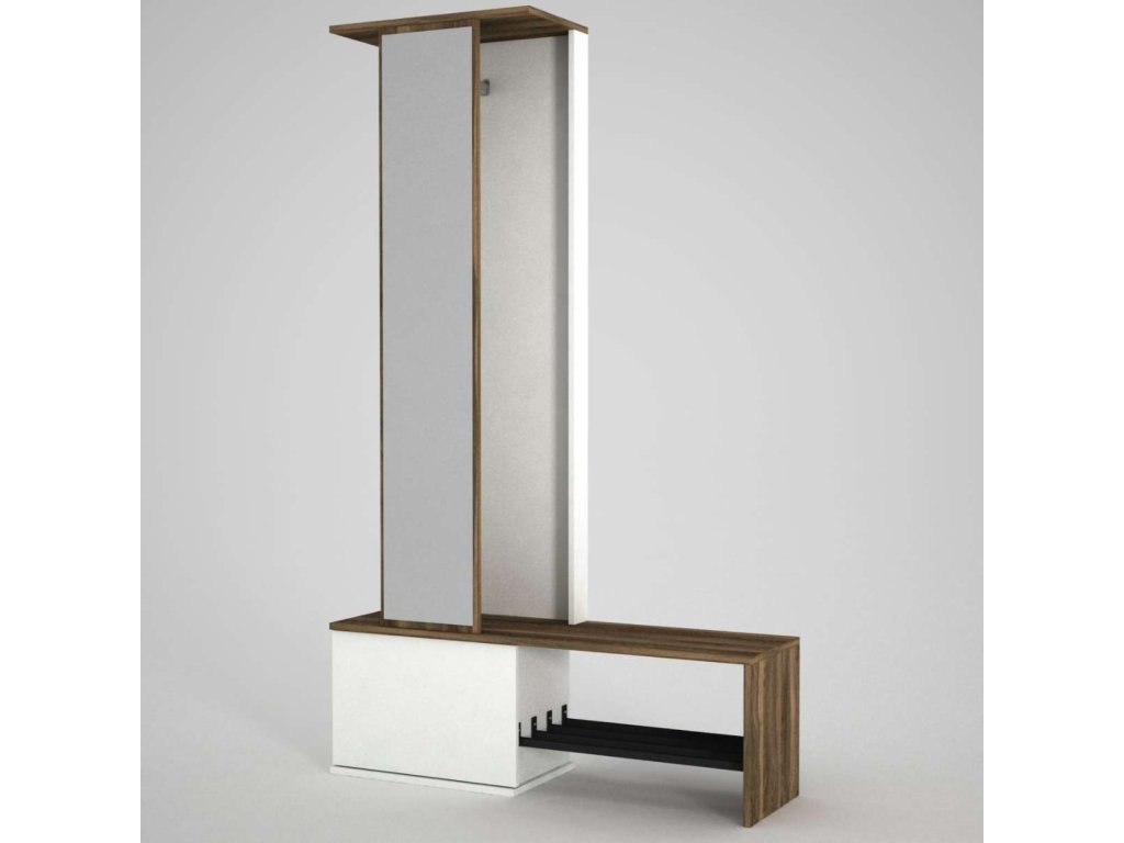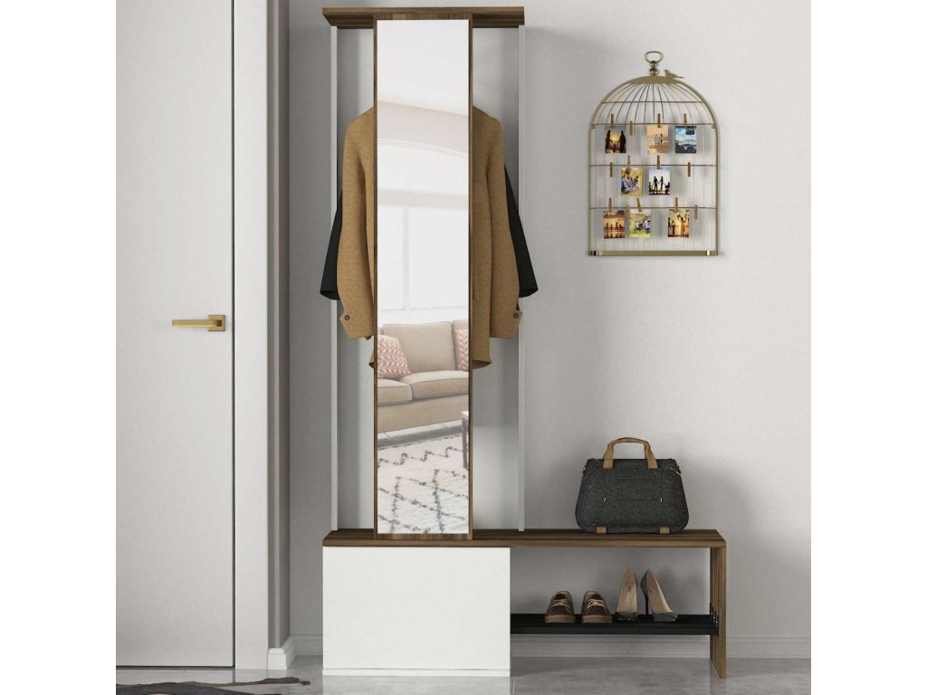 Predsiňová zostava GABRI ponúka praktické úložné riešenie pre vašu predsieň vďaka kombinácii vešiakov, zrkadla a výklopných priehradok. Vyrobená z kvalitných materiálov LTD a skla s hrúbkou 18 mm, zaručuje dlhú životnosť a odolnosť. Elegantný dizajn v kombinácii bielej a orechovej farby dodáva zostave moderný a prírodný vzhľad, ktorý sa ľahko integruje do akéhokoľvek interiéru.