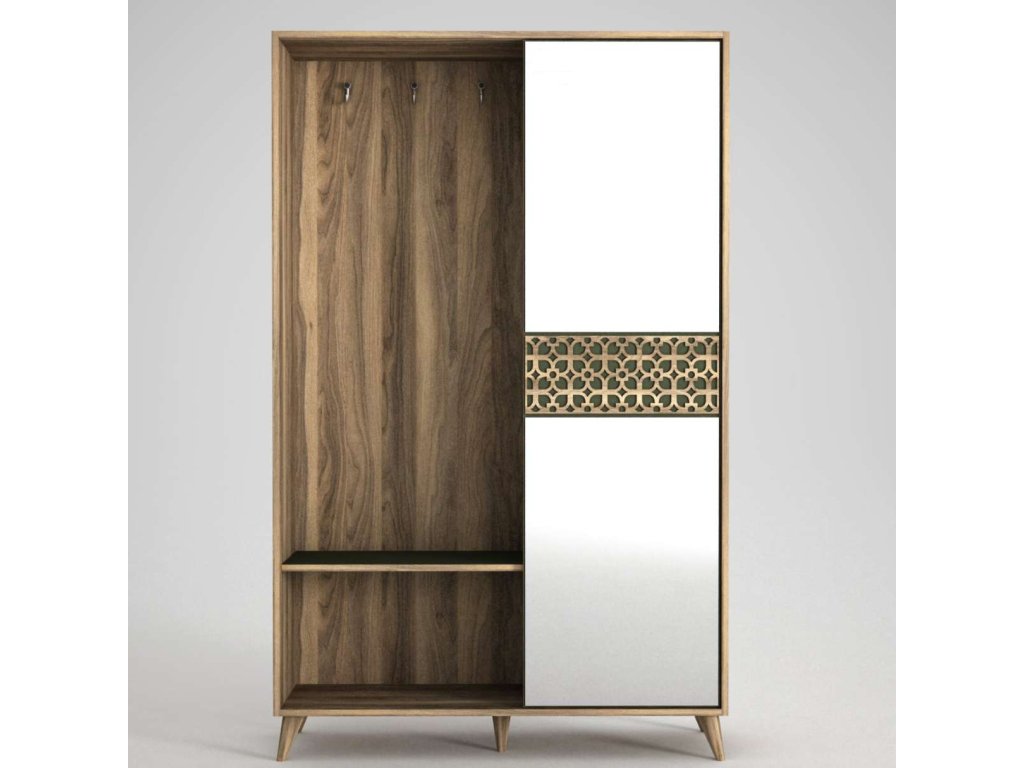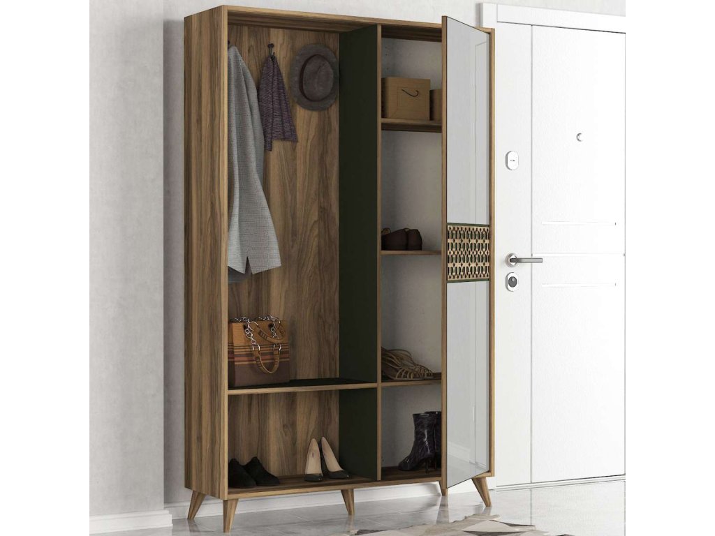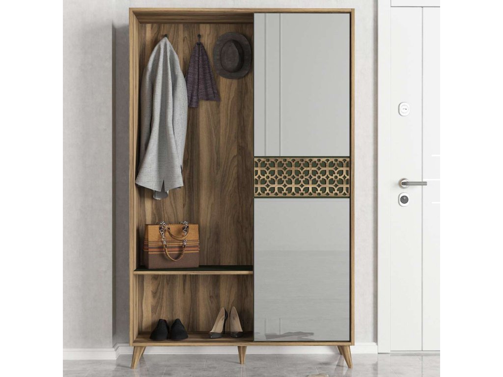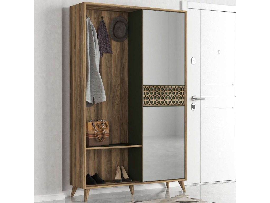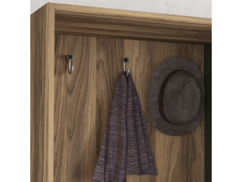 Predsiňová zostava MALVIN ponúka kombináciu vešiakov, zrkadla a skrine, čo zaisťuje dostatok úložného priestoru pre všetky vaše potreby. Vyrobená z kvalitných materiálov LTD a skla s hrúbkou 18 mm, zaručuje dlhú životnosť a odolnosť. Elegantný dizajn vo farbe orecha dodáva zostave moderný a prírodný vzhľad, ktorý ľahko zapadne do každého interiéru.