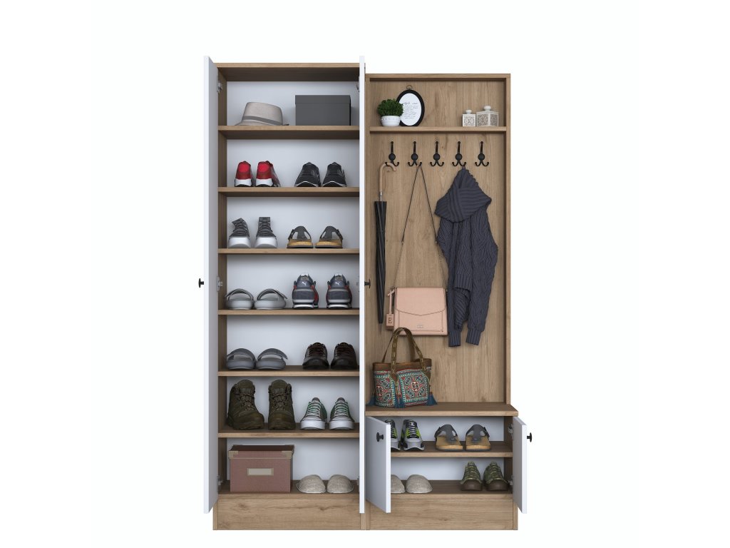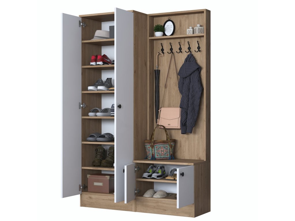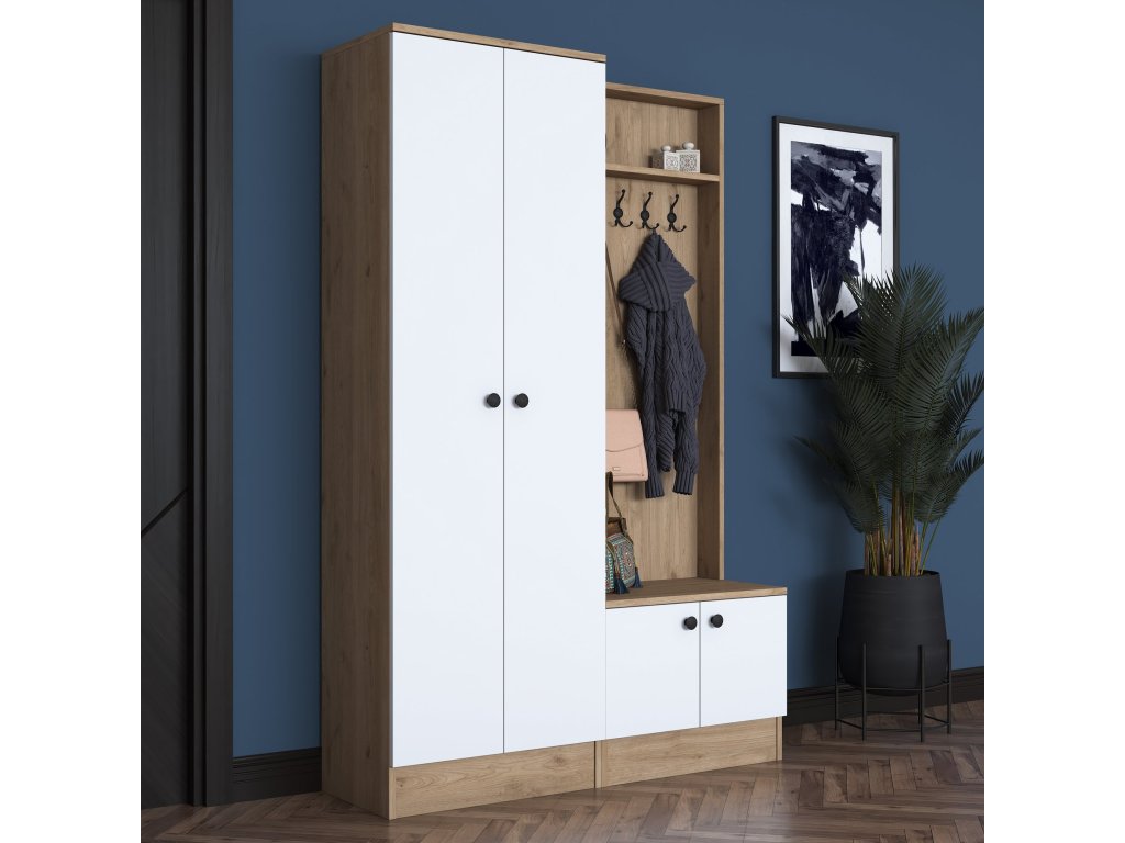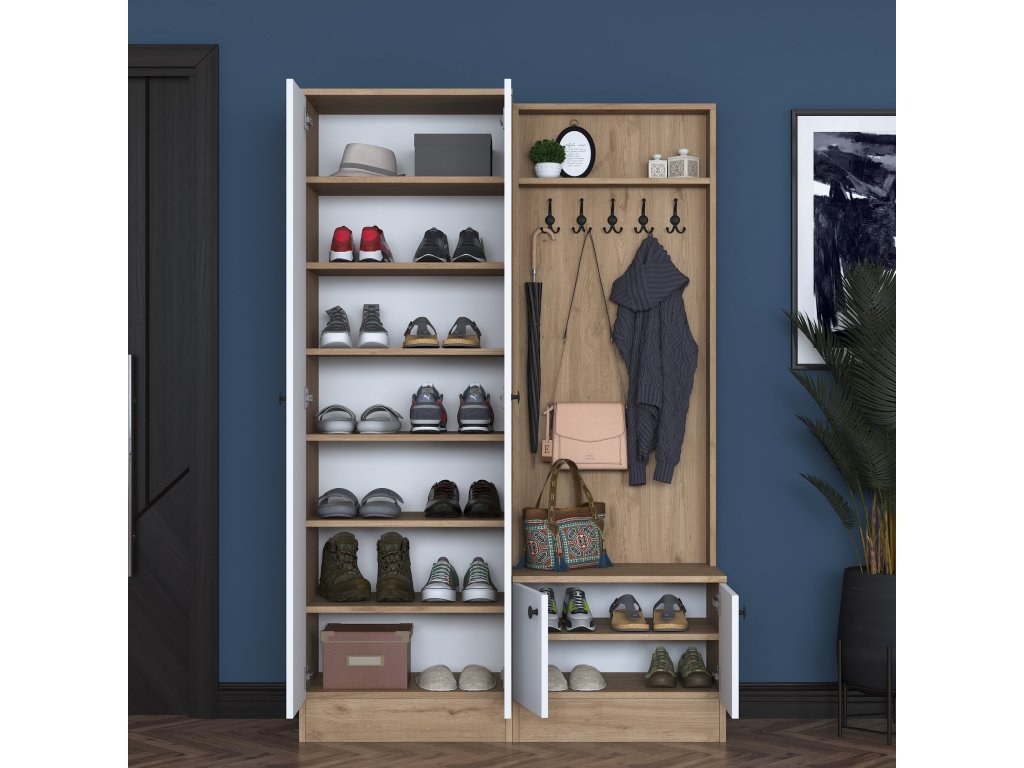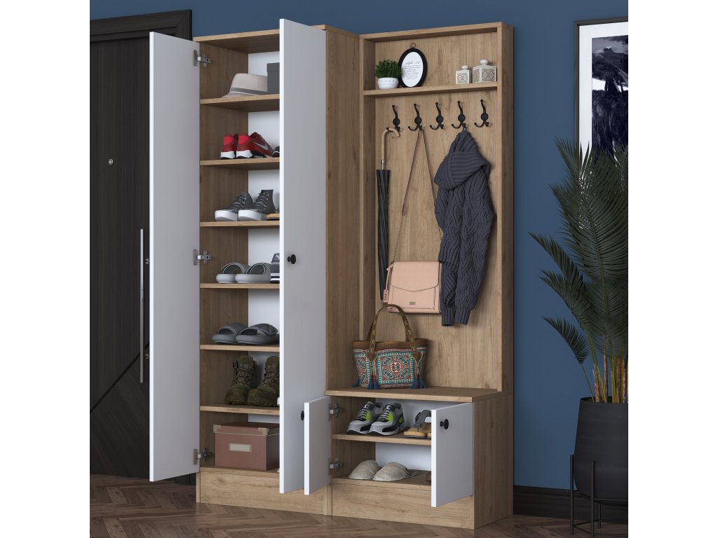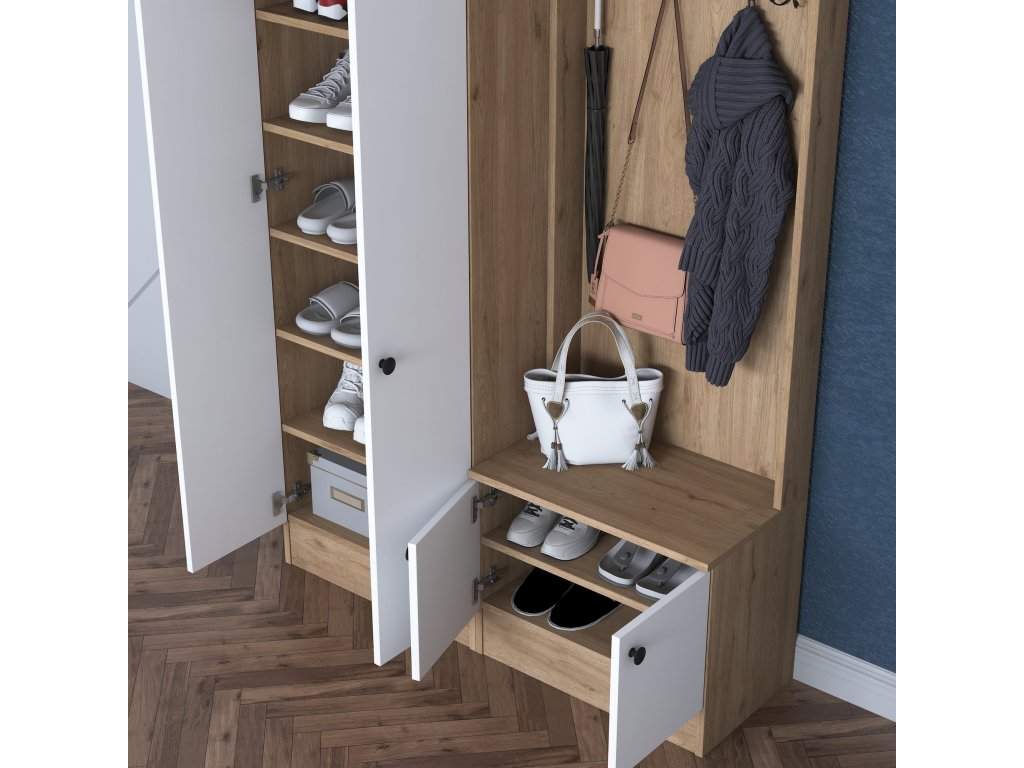 Predsiňová zostava TOMATO je navrhnutá tak, aby spájala moderný štýl s praktickým využitím priestoru. Kombinácia bielej farby a dekoru orecha pridáva do predsiene sviežosť a eleganciu, zatiaľ čo jej usporiadanie pomáha udržať všetko prehľadné a organizované.