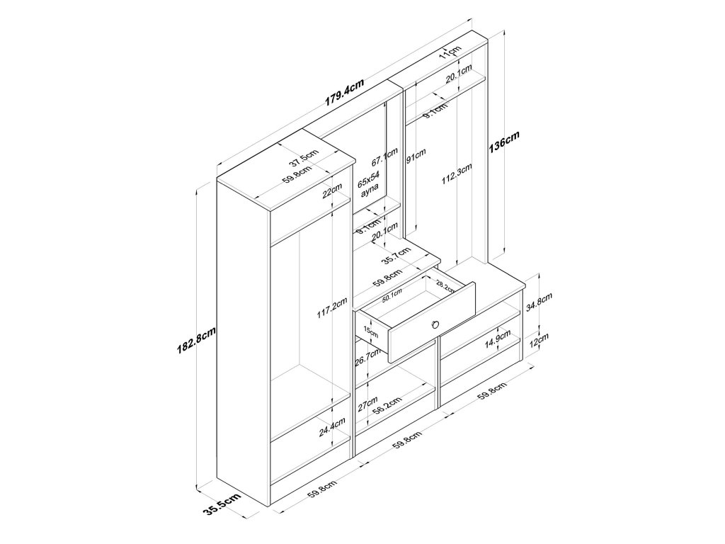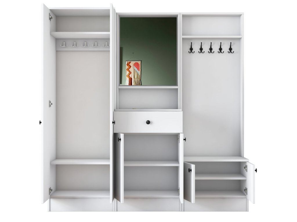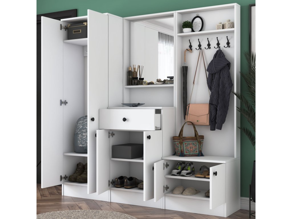 - Rozmery: 182,8 x 179,4 x 37,3 cm – priestranná zostava pre organizáciu každej predsiene.
