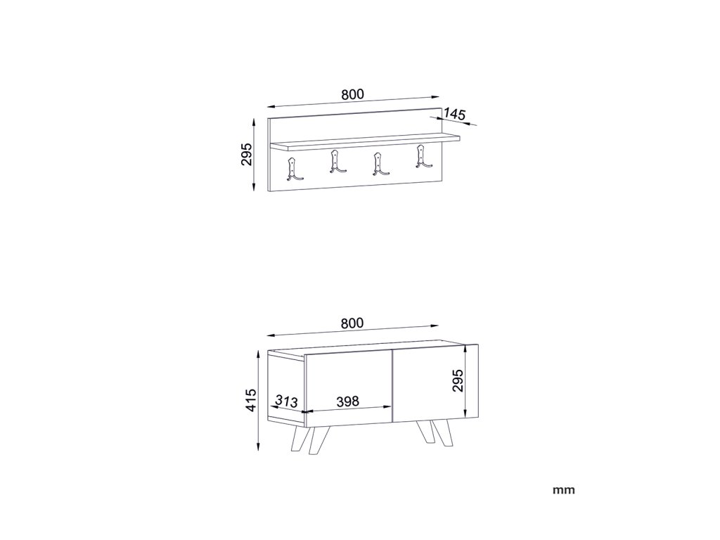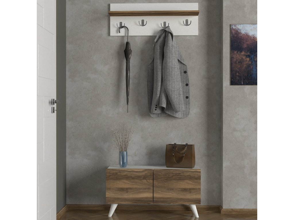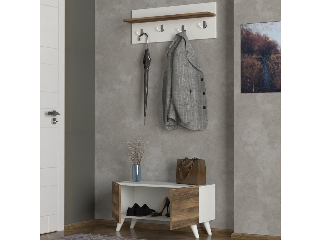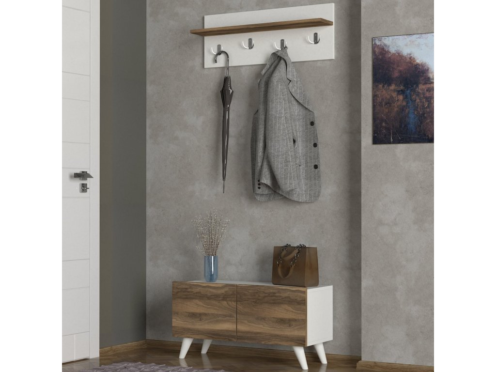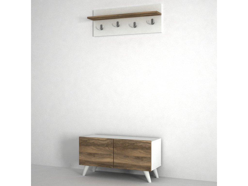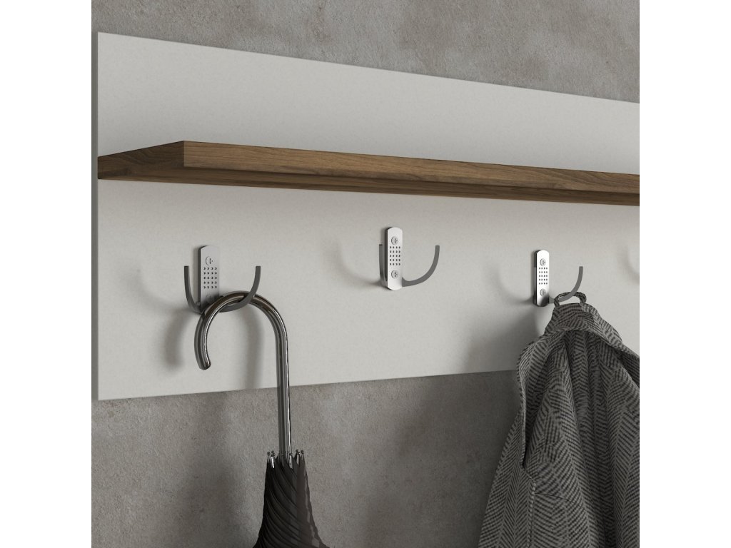 Predsiňová zostava SOREN bude ozdobou každej predsiene. Vďaka svojim rozmerom je vhodná predovšetkým do malých priestorov. Disponuje všetkým čo do predsiene potrebujete a do praktickými vešiakmi na závesnom paneli s policou a moderným botníkom na štýlových bielych nožičkách.