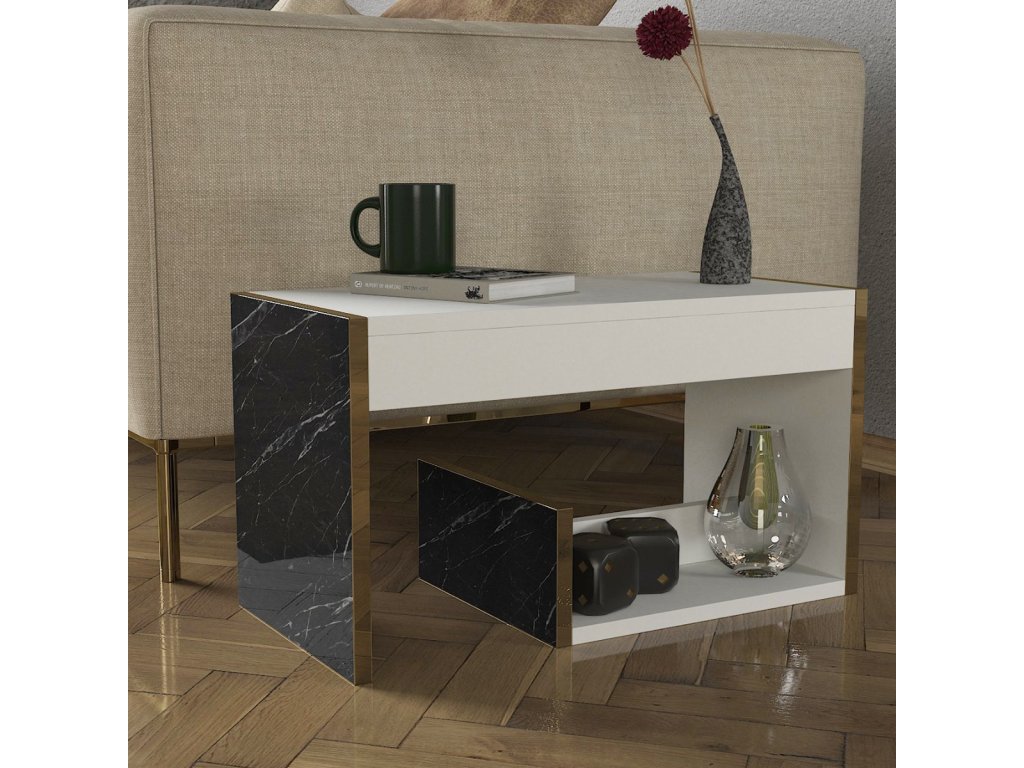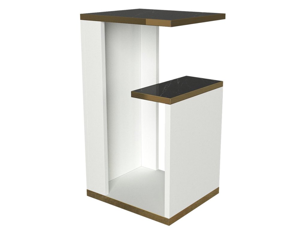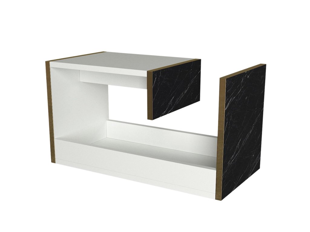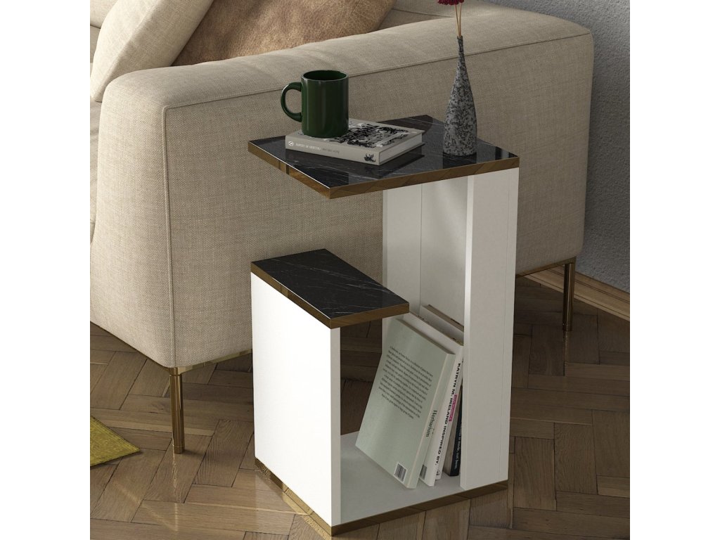 Príručný stolík DELUXE RAVENA je v jednoduchom prevedení a zaujímavom tvare, vhodný na odloženie kníh, časopisov a ostatných drobností, ktoré chcete mať vždy po ruke. Zaujímavosťou stolíka je jeho použitie na šírku aj na výšku, takže ho viete využívať presne tak, ako v daný moment potrebujete. Stolík sa ľahko kombinuje s akýmkoľvek nábytkom a vďaka svojmu farebnému prevedeniu v kombinácii biela + čierny mramor a dizajnové prvky v zlatej farbe, bude ozdobou nejedného interiéru.