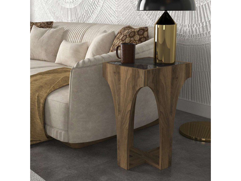 Stolík TITUS sa pýši nádherným orechovým prevedením, ktoré v kombinácii so sklenenými prvkami prináša do vášho interiéru nádych elegancie a sofistikovanosti. Vďaka robustnej konštrukcii z LTD materiálu s hrúbkou 18 mm a sklu je stolík pevný a odolný.