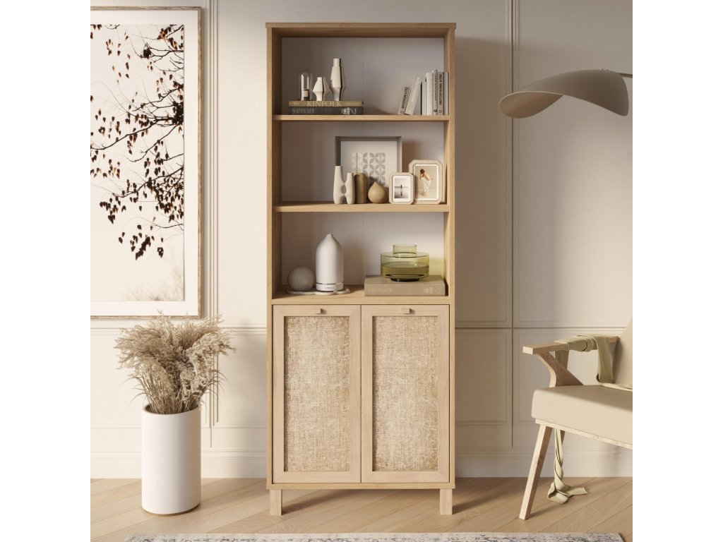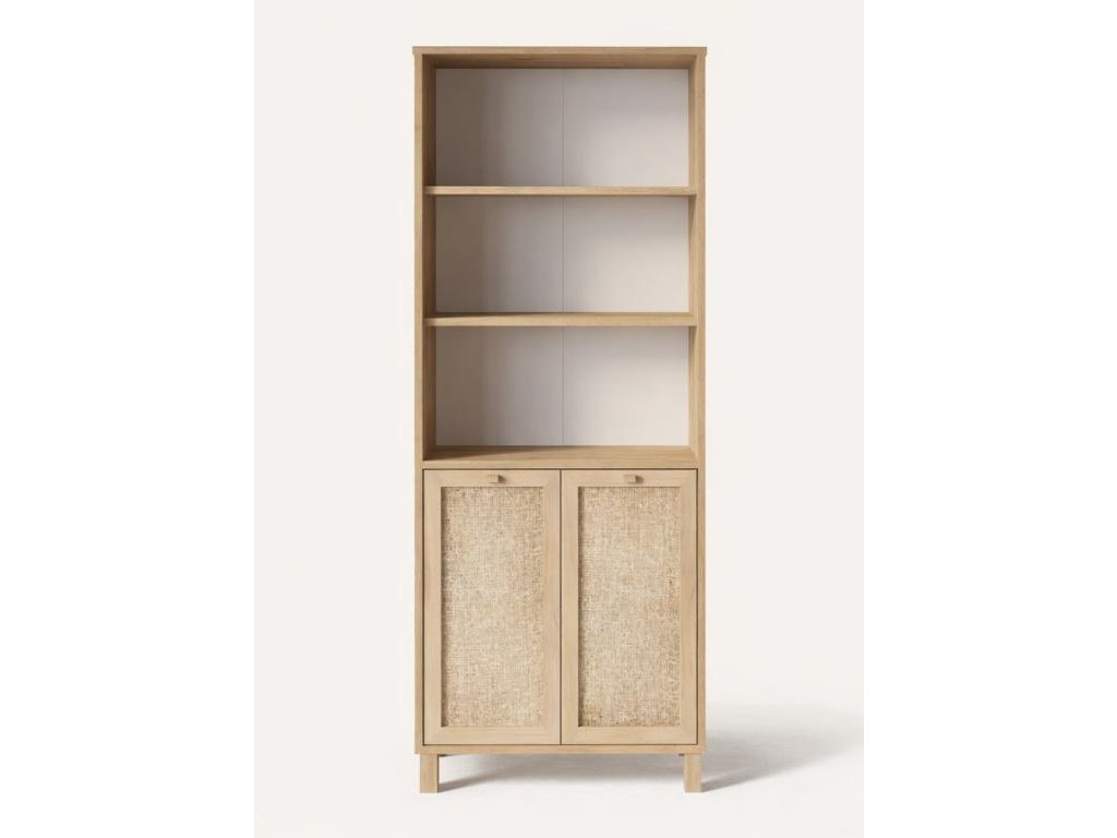 Knižnica BIBO je štýlový a praktický nábytok do obývačky, ktorý vyniká originálnym orientálnym dizajnom. Prevedenie v odtieni sepet s jutovým vzorom dodáva interiéru teplý a prirodzený charakter. Vďaka vysokému prevedeniu ponúka dostatok priestoru na knihy aj dekorácie.