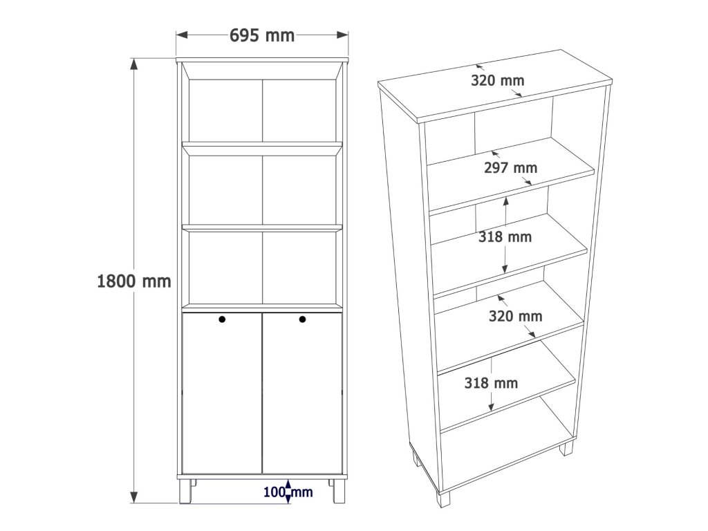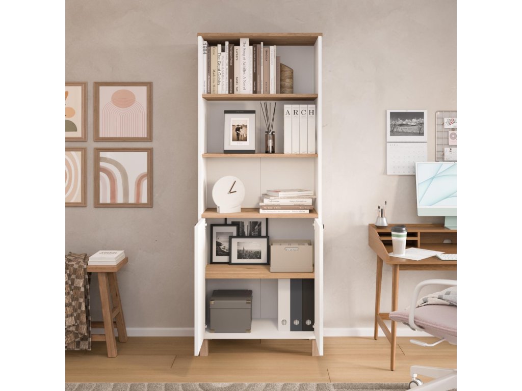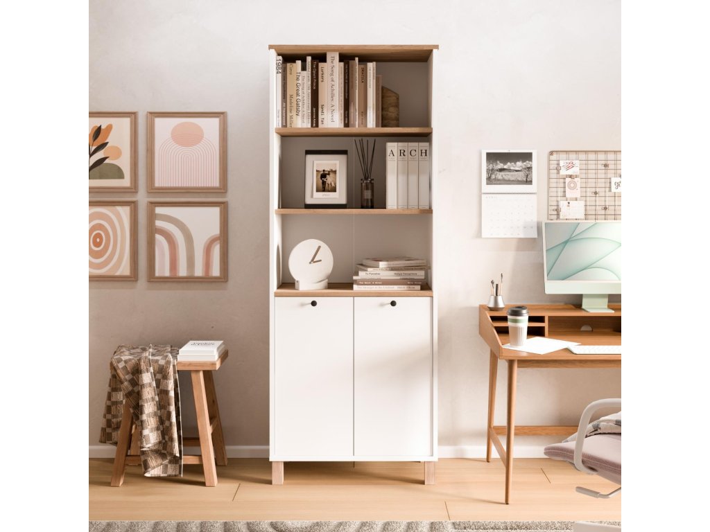 Vyrobená je z kvalitného melamínu a VT laminátu, čo zabezpečuje pevnosť, odolnosť a jednoduchú údržbu. Knižnica disponuje 2 plnými dvierkami a 2 policami, ktoré umožňujú prehľadné usporiadanie kníh, dokumentov či doplnkov. Úchytky z matného čierneho kovu dodávajú nábytku moderný kontrastný prvok.