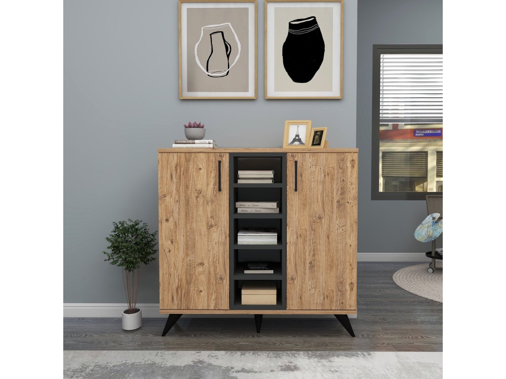 Knižnica PETER je ideálnou voľbou pre každého, kto hľadá kombináciu štýlového dizajnu a funkčnosti. Vďaka svojmu obdĺžnikovému tvaru a kompaktným rozmerom sa hodí do každej obývačky. Knižnica ponúka dostatok úložného priestoru vďaka štyrom policam a dvom plným dvierkam, ktoré chránia vaše veci pred prachom.