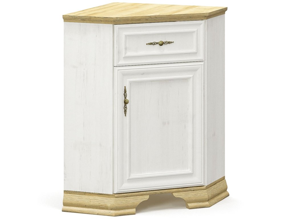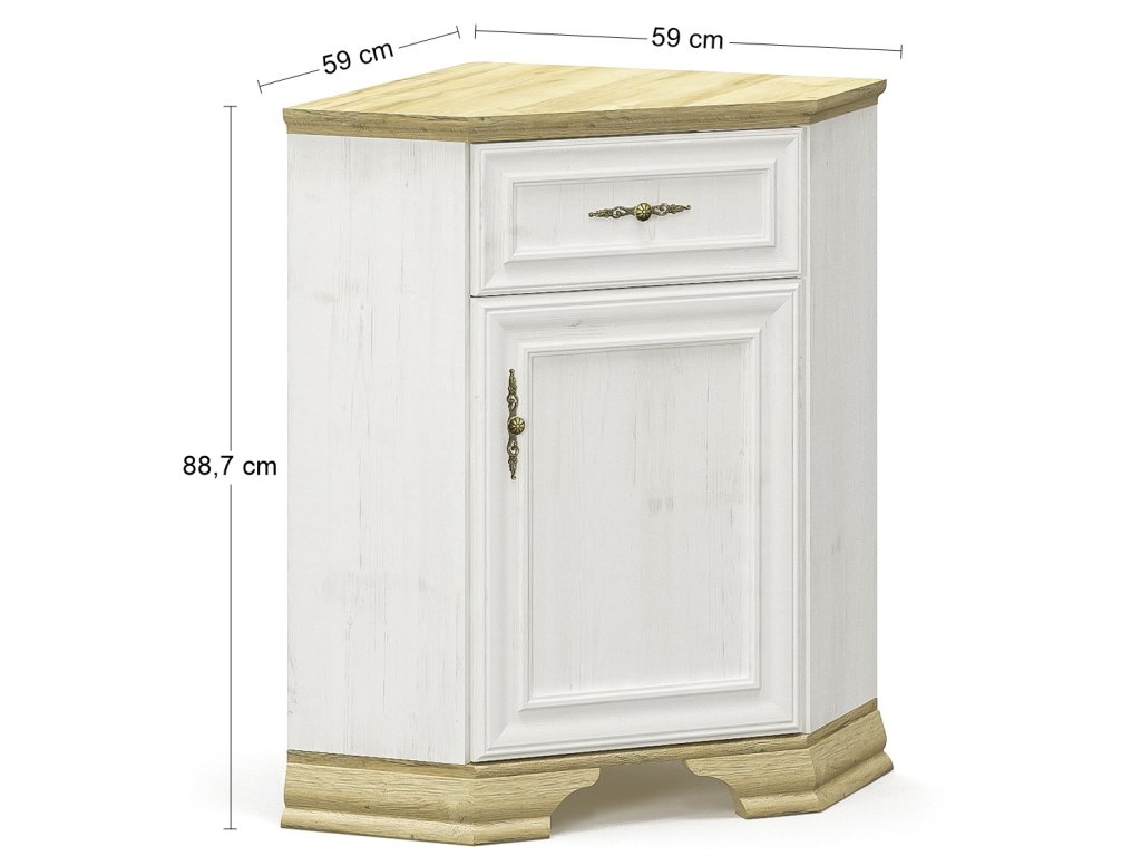 Rohová komoda JARMANKA disponuje jednodverovou skrinkou, nad ktorou je zásuvka.