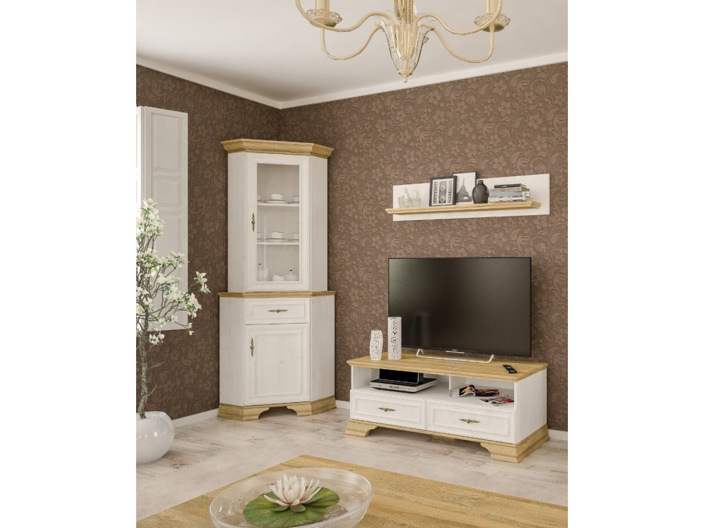JARMANKA je sektorový prvok s rustikálnym nádychom. Jeho štýlové prevedenie je podfarbené kombináciou kontrasných farieb borovice anderson a dub zlatý. Svetlé farby rozjasnia priestor a opticky ho zväčšia. Efektné úchyty s ornamentom v zlatom farebnom prevedení, dodávajú nábytku šmrnc a eleganciu. Elegantné oblé hrany nájdete ako na štýlovom prevedení nožičiek, tak aj na dvierkach a hornej zakončovacej lište.