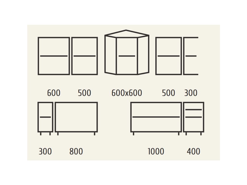 | Zostava obsahuje: | Horná skrinka 60, skrinka 50, rohová skrinka 60 x 60, skrinka 50, regál 30, dolná skrinka 30, drezová skrinka 80, rohová skrinka 100, skrinka |