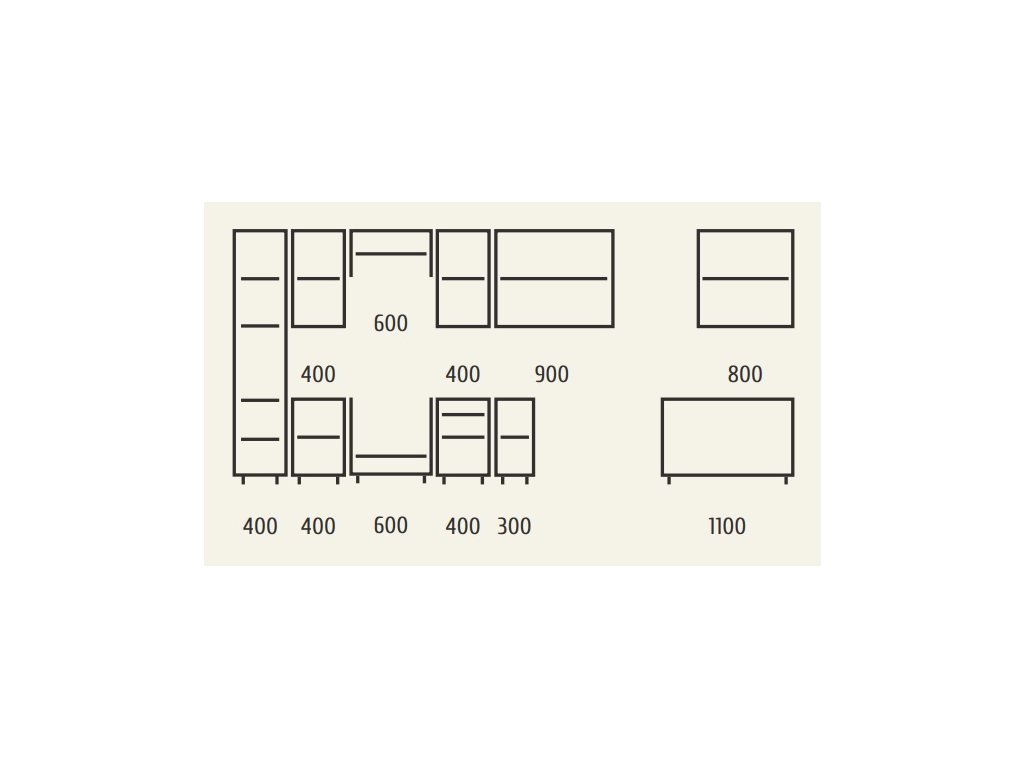 | Zostava obsahuje: | vysoká skrinka 40 cm, horná skrinka 40, digestorová skrinka 60, horná 40 cm, rohová skrinka 90, skrinka 80, dolná skrinka 40, skrinka na vstavanú rúru 0, 4 drezová skrinka 110 cm |