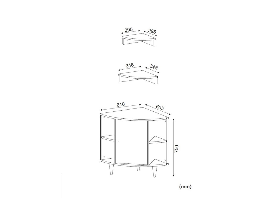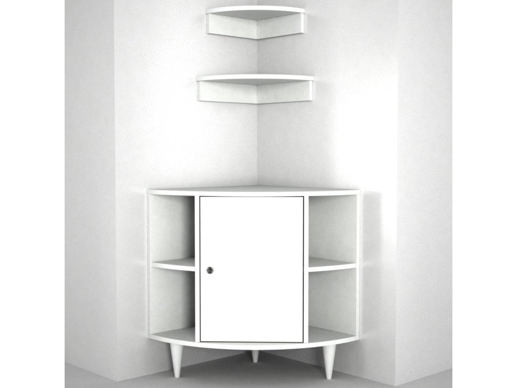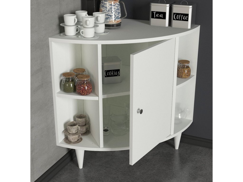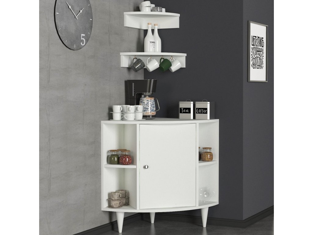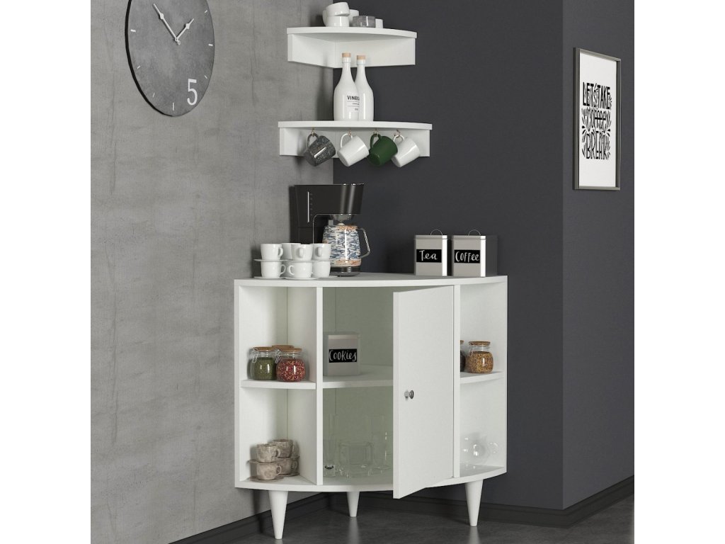 Netradičná štýlová rohová skrinka/stolík ROXEN bude svelým doplnkom Vašej kuchyne či jedálne v prípade, že ste vlastníkom kávovaru a túžite po svojom kávovom kútiku. Ponúka bohatý úložný priestor ktorý určite oceníte a vďaka štýlovým tvarovaným nožičkám bude ozdobou každej domácnosti. Skvelým bonusom sú aj rohové závesné police v cene, ktoré vyplnia prázdny priestor nad skrinkou a sú ideálne na vystavenie dizajnových čajových súprav. Tento moderný kúsok nábytku Vám budú všetci závidieť.