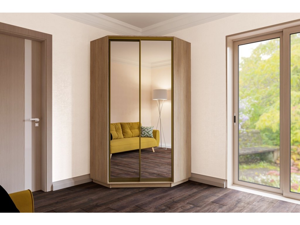 CORZA šatníková skriňa do rohu so zrkadlom na dvierkach.