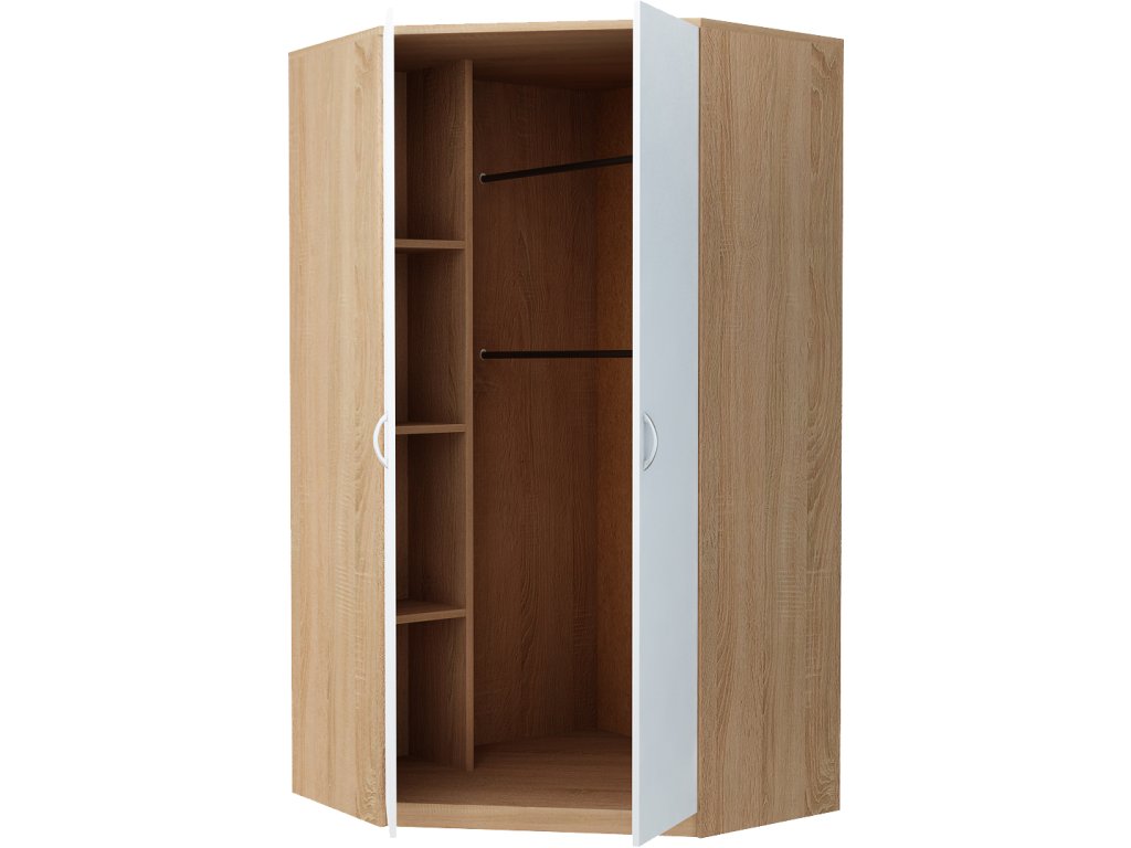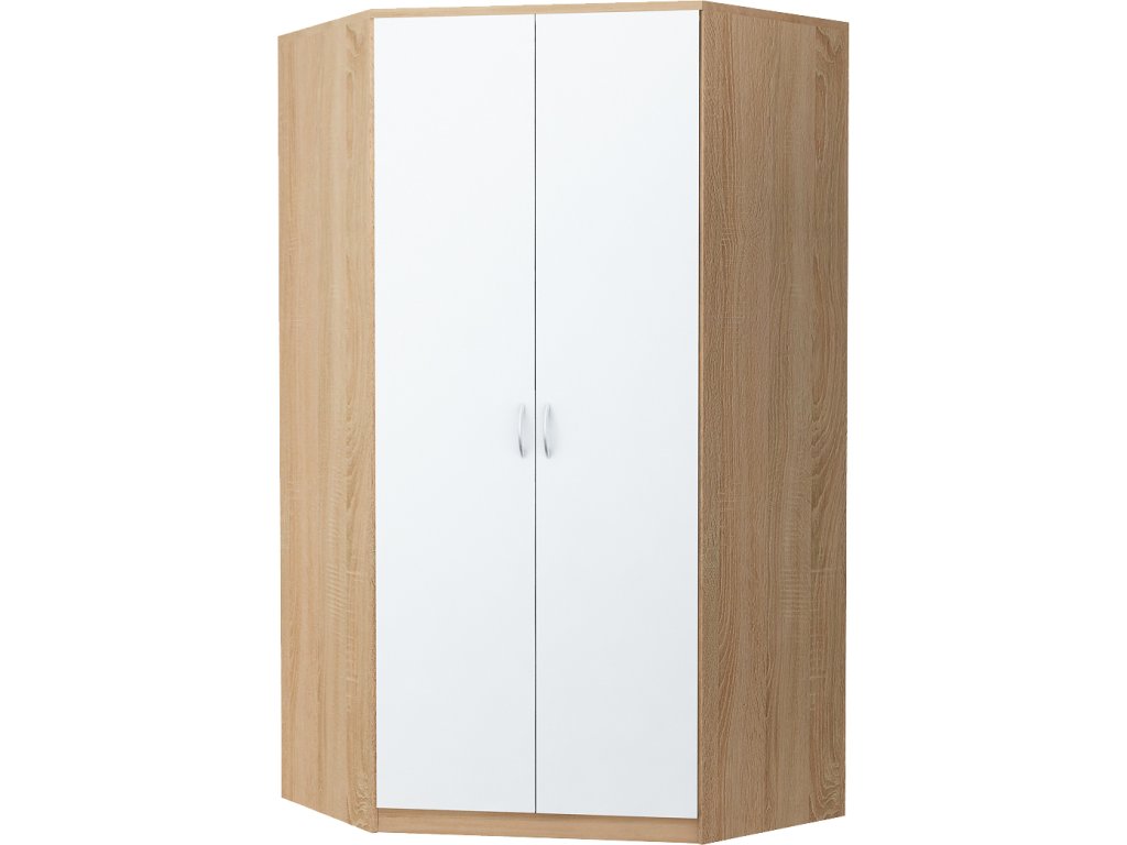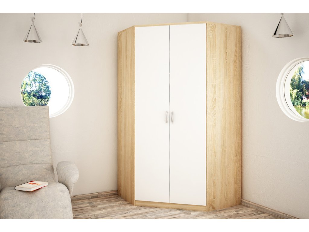 Rohová 2-dverová šatníková skriňa ALEŠ Vám poskytne množstvo úložného priestoru. K dispozícií máte 2 vešiakové tyče a 4 priestranné police. Skriňa je vyrobená z kvalitnej LTD dosky. Korpus skrine je v obľúbenom farebnom prevedení dub sonoma, dvierka a zásuvky sú v bielej farbe. K dispozícií máte ďalších 6 farebných prevedení na výber. Úchytky sú z plastu vo farbe alumínium oblého tvaru. Dodávame v demontovanom stave.Dodatočné parametre