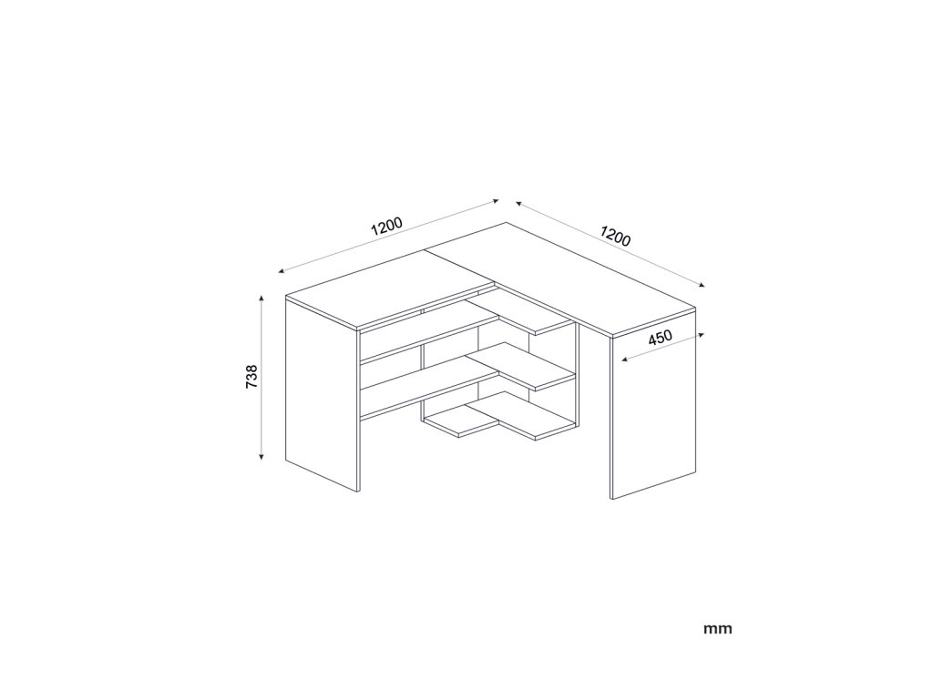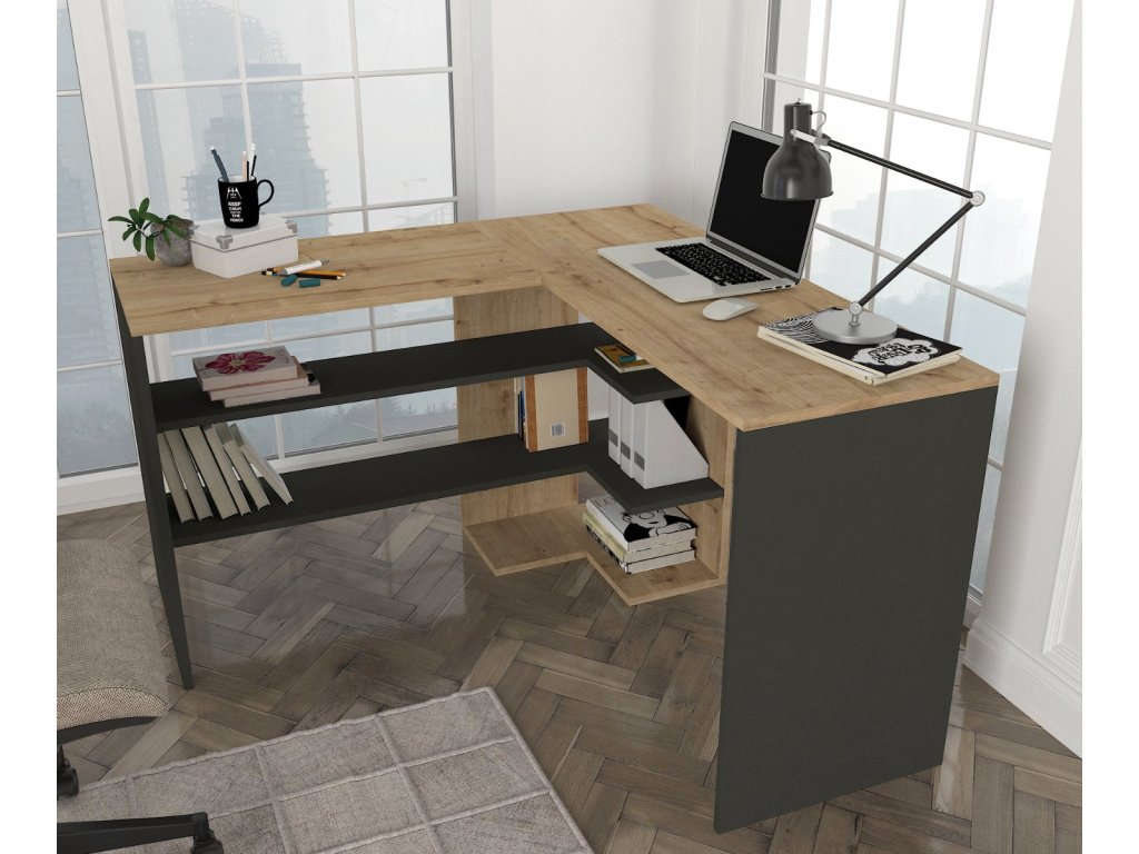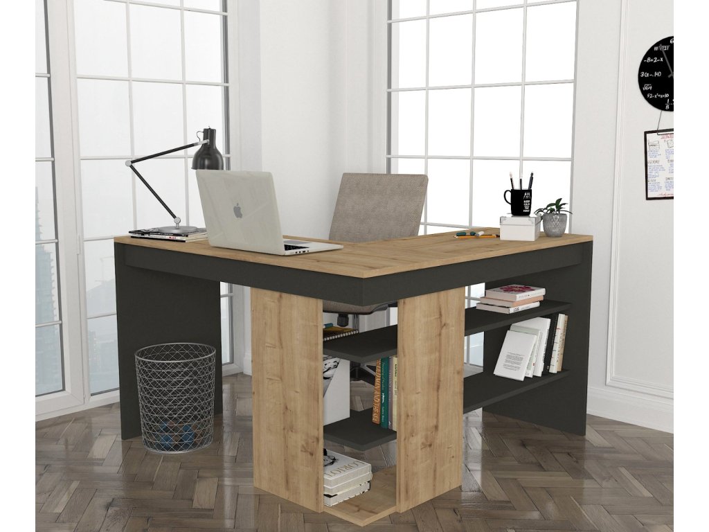 Písací rohový stôl STICH poskytuje dostatok úložného priestoru vo forme otvorených políc, ktoré sú pod pracovnou doskou. Vďaka rohovému prevedeniu disponuje bohatým pracovným priestorom, takže o Váš komfort pri prái bude dokonale postarané.