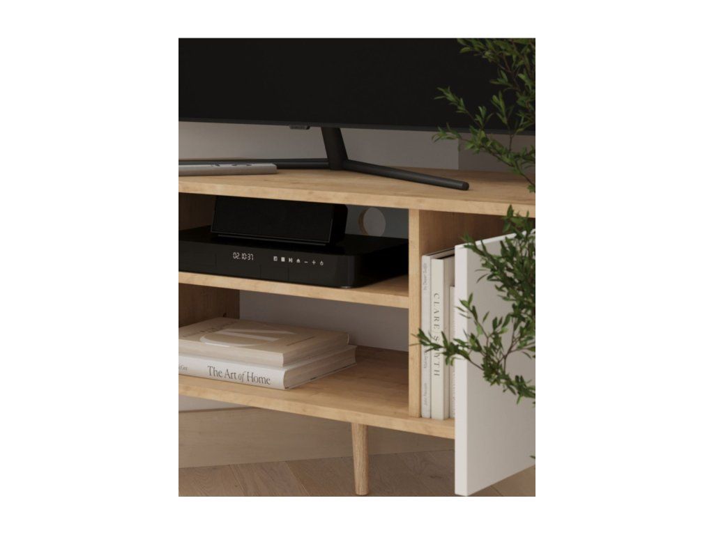 TV stolík disponuje otvorenými policami pre multimediálne zariadenia a uzatvárateľnými skrinkami, kde môžete uložiť káble, ovládače či ďalšie doplnky. Praktická horná doska poskytuje stabilné miesto pre televízor aj dekorácie.