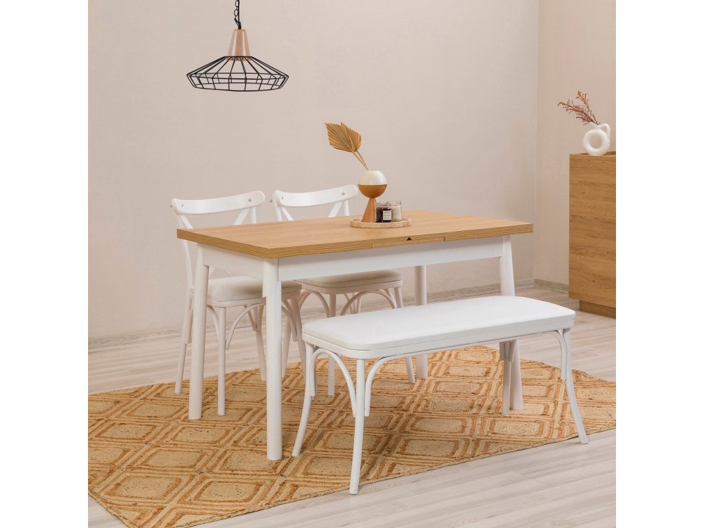 Tento jedálenský stôl je vyrobený zo 100% drevotriesky s melamínovým povlakom a je navrhnutý tak, aby vydržal. Vysoko kvalitný materiál zaisťuje odolnosť a odolnosť voči poškriabaniu, škvrnám a teplu. Jeho čisto biela farba dodá každému interiéru nádych sofistikovanosti a vytvorí čistý a moderný vzhľad.