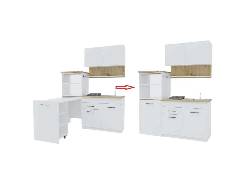 | Zostava obsahuje: | závesnú skrinku - výška 76, hĺbka 31,6 a šírka 100, multifunkčná skrinka s výsuvným stolom - výška 147, hĺbka 58 a šírka 60, skrinka s drezom - výška 820, hĺbka 58 a šírka |