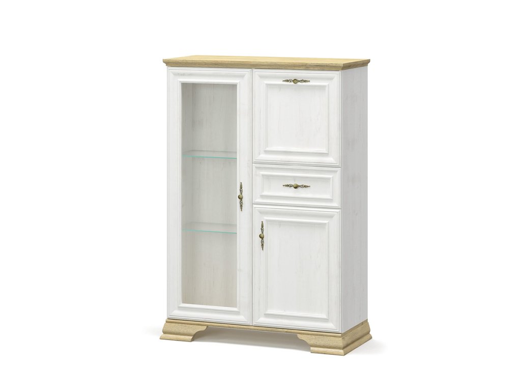 JARMANKA je sektorový prvok s rustikálnym nádychom. Jeho štýlové prevedenie je podfarbené kombináciou kontrasných farieb borovice anderson a dub zlatý. Svetlé farby rozjasnia priestor a opticky ho zväčšia. Efektné úchyty s ornamentom v zlatom farebnom prevedení dodávajú nábytku šmrnc a eleganciu. Elegantné oblé hrany nájdete ako na štýlovom prevedení nožičiek tak aj na dvierkach a hornej zakončovacej lište. Barová skrinka má v ľavej časti presklené dvierka, za ktorými nájdete 2 sklenené poličky. Tie sú vhodné na umiestnenie dekoračných predmetov či fotiek. Pravá časť je rozdelená na 3. Horná časť s výklopným systémom je určená pre „bar“. Pod ňou je umiestnený praktický šuplík. Spodná časť ponúka uzavretý odkladací priestor s 1 vnútornou poličkou. Rozmery (š/v/h): 93,4 x 133 x 39 cm. V našej ponuke nájdete aj ďalšie prvky sektora JARMANKA, z ktorých si viete poskladať štýlovú obývaciu izbu. Dodávame v demonte.