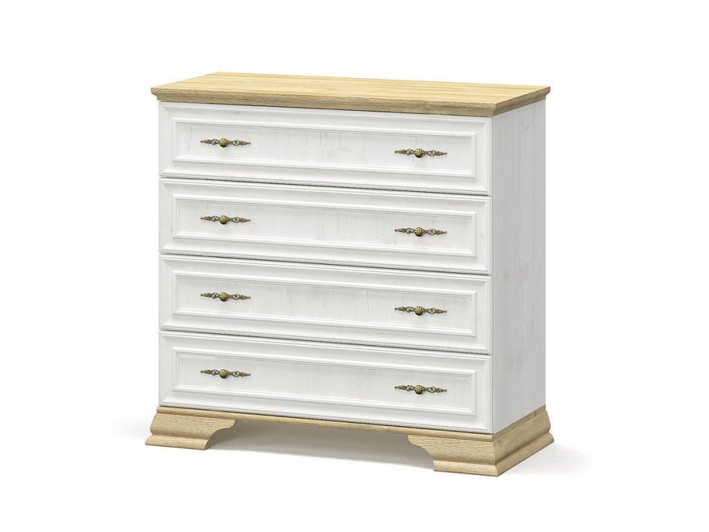 JARMANKA je sektorový prvok s rustikálnym nádychom. Jeho štýlové prevedenie je podfarbené kombináciou kontrastných farieb borovice anderson a dub zlatý. Svetlé farby rozjasnia priestor a opticky ho zväčšia. Efektné úchyty s ornamentom v zlatom farebnom prevedení, dodávajú nábytku šmrnc a eleganciu. Elegantné oblé hrany nájdete ako na štýlovom prevedení nožičiek tak aj na dvierkach a hornej zakončovacej lište. Komoda ponúka úložný priestor rozdelený na 4 šuplíky. Nábytok je vyrobený z kvalitnej LTD dosky, ktorej nenáročnosť na údržbu ocení každý majiteľ. Rozmery (š/v/h): 93,4 x 88,7 x 39 cm. V našej ponuke nájdete aj ďalšie prvky sektora JARMANKA, z ktorých si viete poskladať štýlovú obývaciu izbu či efektnú spálňu. Dodávame v demonte.Dodatočné parametre