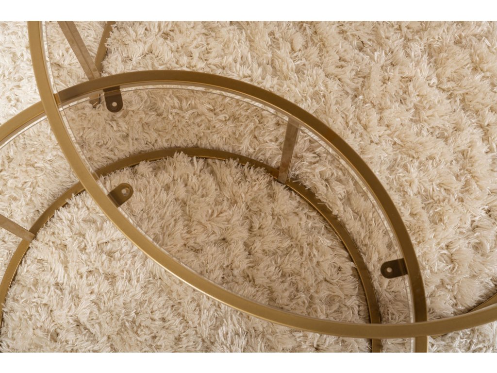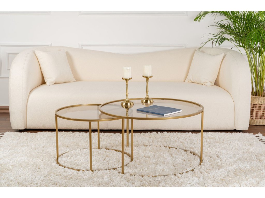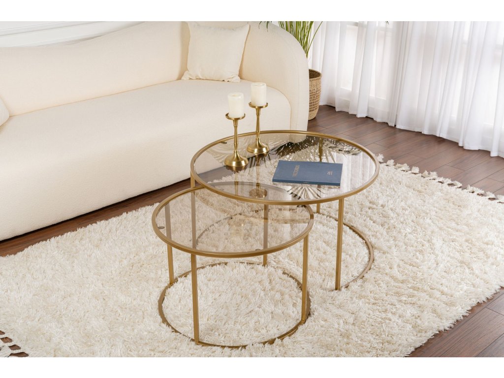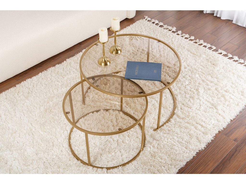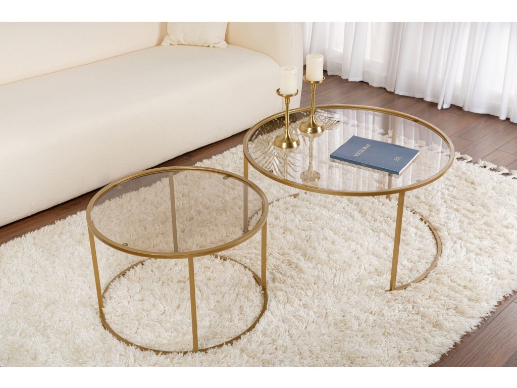 Dodajte svojmu domovu nádych modernej elegancie s touto nádhernou sadou konferenčných stolíkov. Kombinácia zlatej a bronzovej farby vytvára luxusný a nadčasový vzhľad, ktorý ohromí vašich hostí a premení vašu obývaciu izbu v ústredný bod vášho domova.