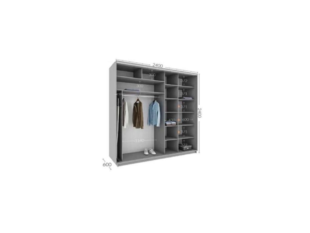 Šatníková skriňa má netypickú výšku, až 240 cm, čím sa zaistí väčší úložný priestor. Skriňa je členená na policovú a závesnú časť s jednou závesnou tyčou.