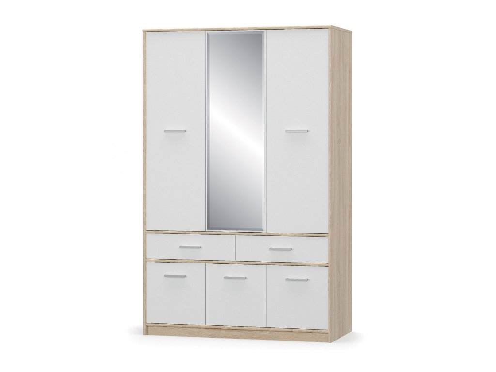 Šatníková skriňa so zrkadlom OLINO je výbornou voľbou pre Vašu spálňu či detskú izbu. Vyrobená je z kvalitnej LTD dosky vo farebnom prevedení dub Sonoma/biela matná, ktoré sa hodia do akéhokoľvek interiéru. Ponúka množstvo odkladacieho priestoru v podobe zásuviek, políc a šatníkovej tyče. Rozmery : (š/v/h) stavu.