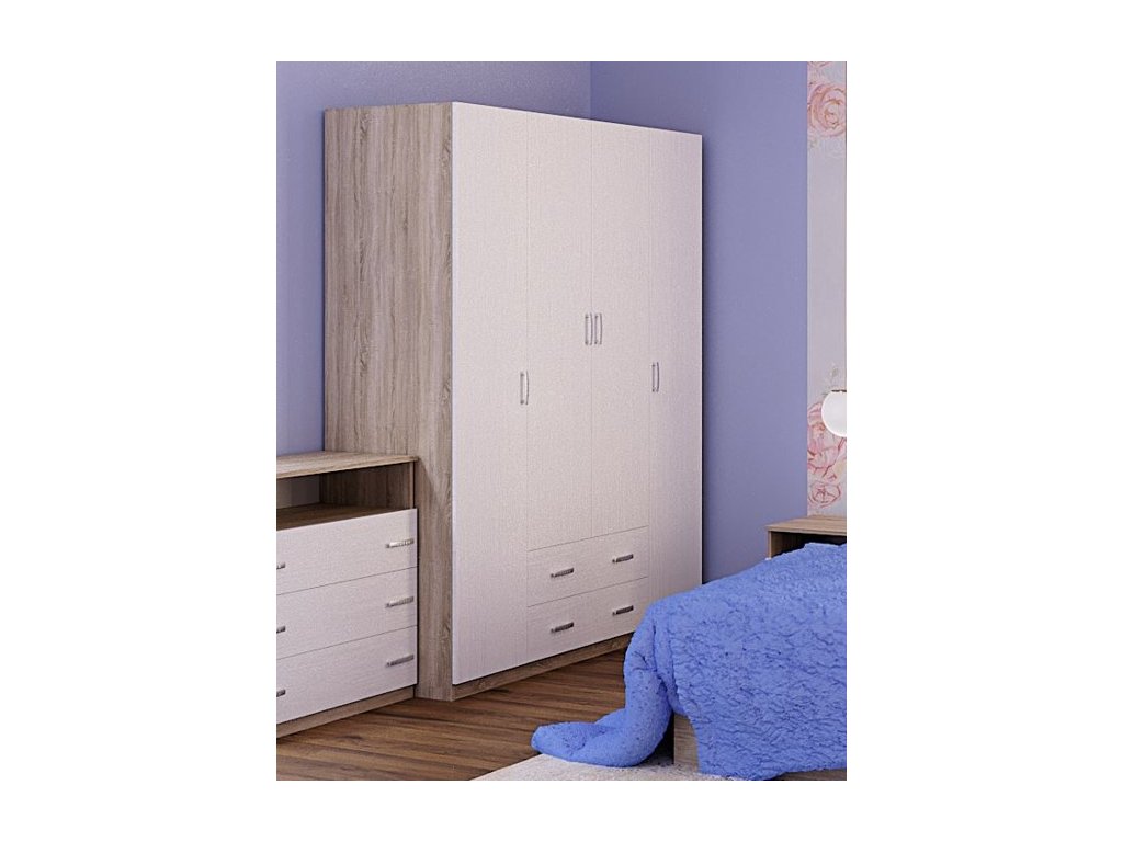 Štvordverová skriňa STANA v kontrastnom farebnom prevedení dub sonoma/biele drevo Vám poskytne dostatok priestoru na uloženie Vašich vecí. V spodnej časti sú dve zásuvky, úchyty sú plastové. Je vyrobená z kvalitnej 16 mm silnej LTD dosky nenáročnej na udržiavanie.