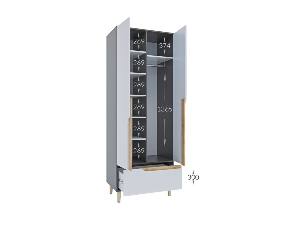 Šatníková skriňa DOOWE NO2 ponúka bohatý úložný priestor v podobe praktickej zásuvky, políc za dvierkami a šatníkovej tyče. Je ideálny do študentských izieb, obývacej izby alebo spálne.