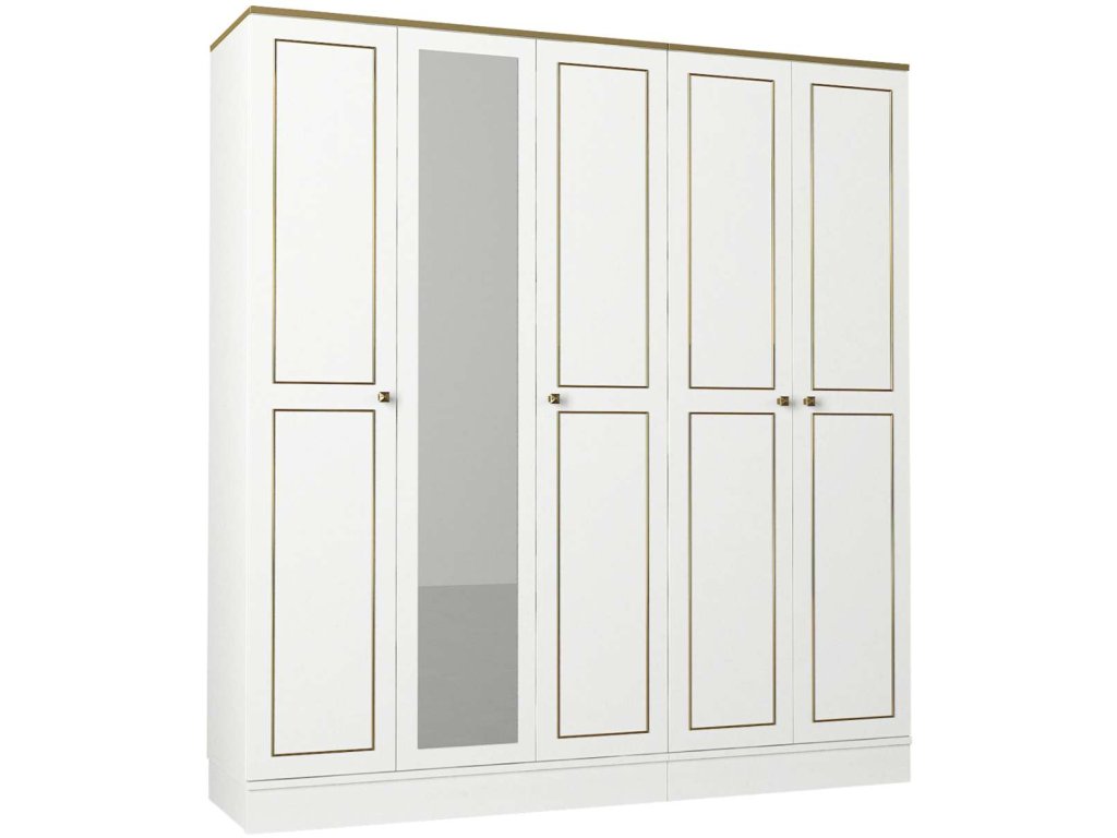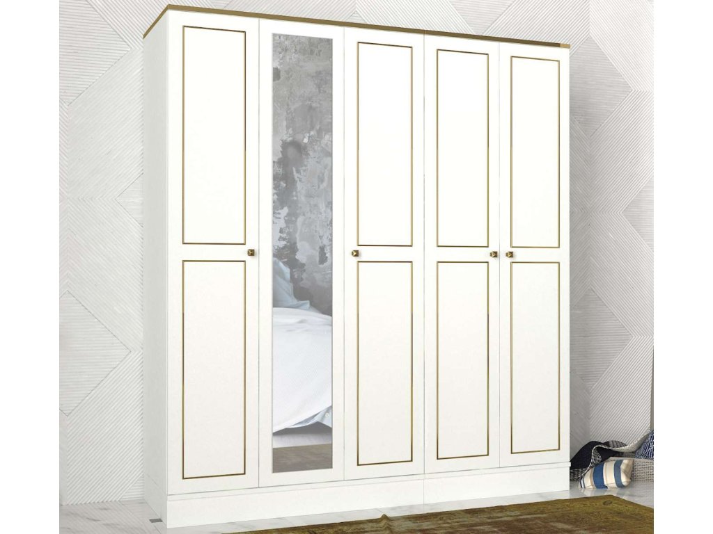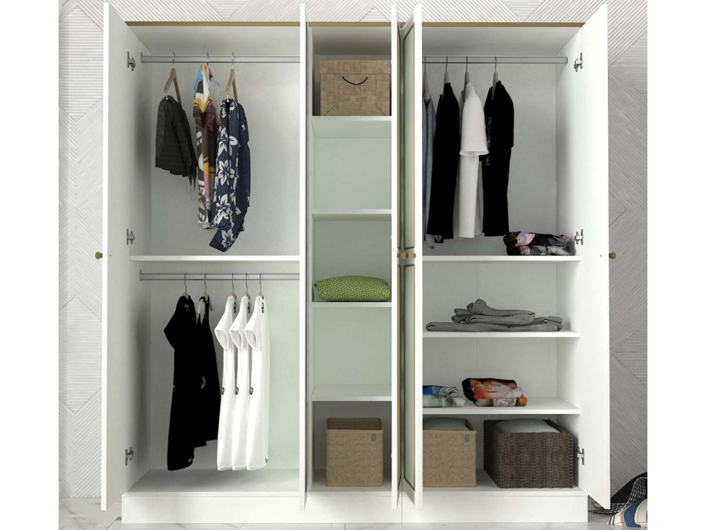 Šatníková skriňa RAVEN 5D vyniká svojim elegantným dizajnom v bielej farbe, ktorý dodá vašej spálni svieži a moderný vzhľad. Praktické vnútorné usporiadanie s tromi šatníkovými tyčami, štyrmi policami a zrkadlom ponúka dostatok úložného priestoru pre vaše oblečenie a ďalšie predmety, zatiaľ čo zrkadlo opticky zväčšuje priestor a dodáva interiéru hĺbku.